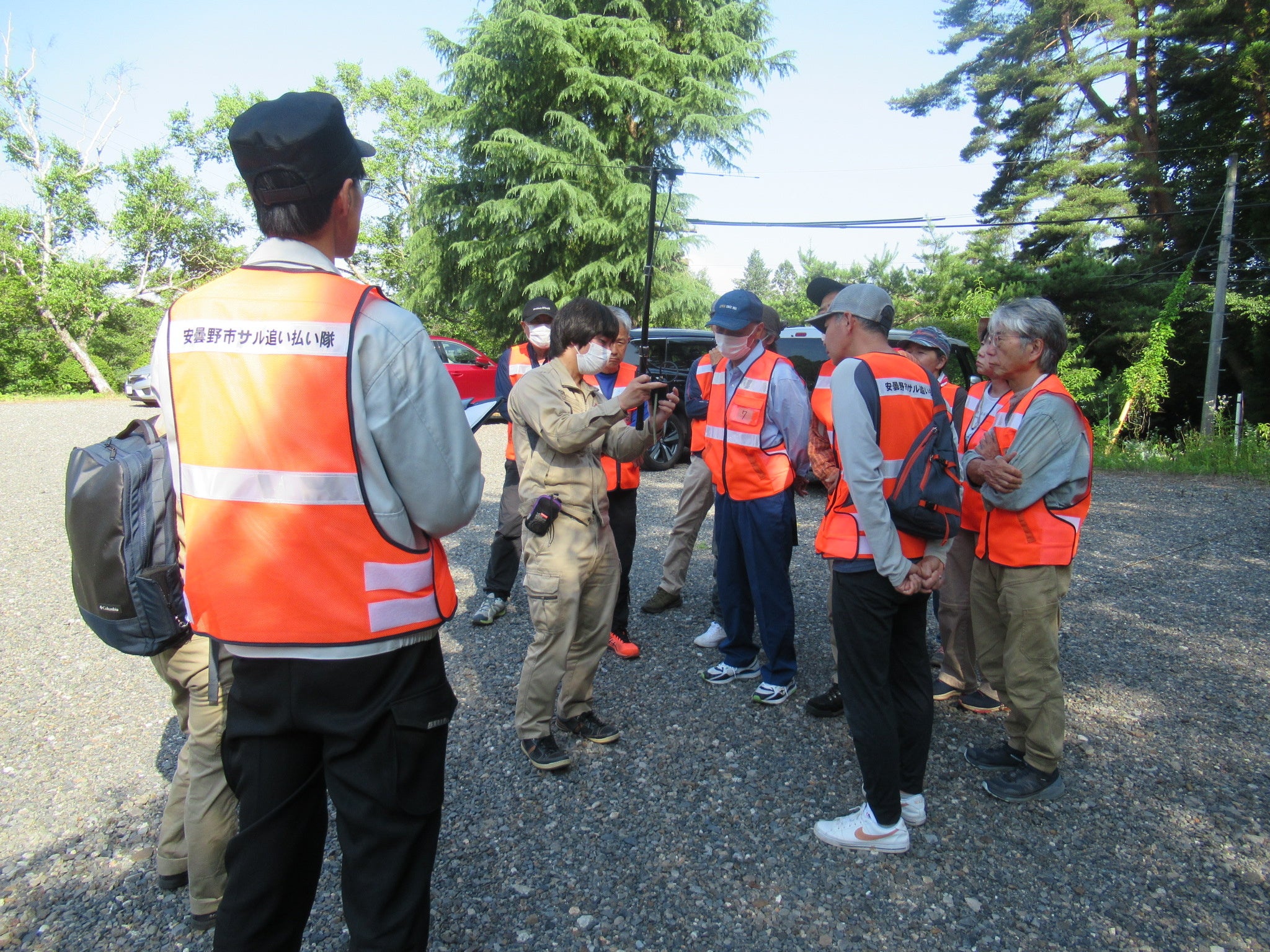 安曇野市では、里地から山のほうへ猿の群れを追い払い、猿の生息域を山側に上げ被害を少なくすることを目的に「ニホンザル追い払い」の取組を行っています。 “追い払い隊員”として登録された市民が、オレンジビブスを着用し毎日地域別で猿の追い払いを行います。