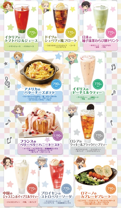 カラオケを楽しむ姿を描いたミニキャライラストを使用したコラボ限定グッズの販売をはじめ、コラボメニューの提供やコラボルームの展開など、『ヘタリア World★Stars』の世界観を存分にお楽しみいただけるコラボキャンペーンになっております。