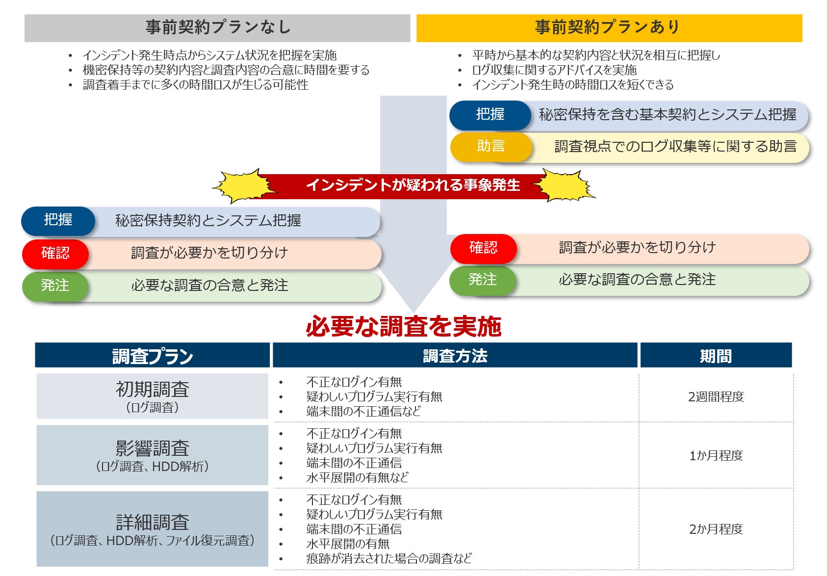 以下の内容を盛り込んだ事前契約の締結 ①秘密保持を含む調査着手に必要な内容 ②問診表によるネットワークやセキュリティ構成等ご確認 ③(②)の結果を受けて調査視点で簡易な助言を実施 ④インシデントが疑われる事象発生時の事前切り分け |