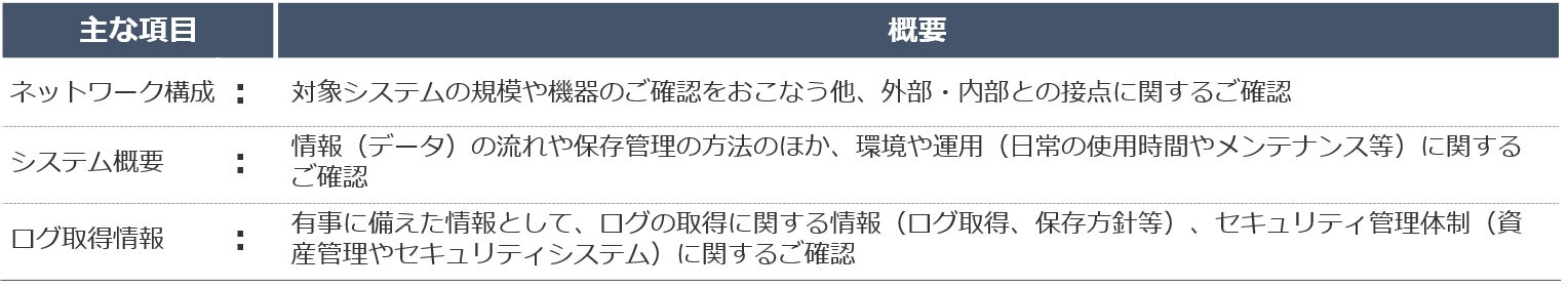 インシデントが発生した際に備え、システム内容やセキュリティ体制などの現状を相互に確認することが目的です。事前に秘密保持契約等を締結し、お客様のネットワーク図等をお預かりいたします。