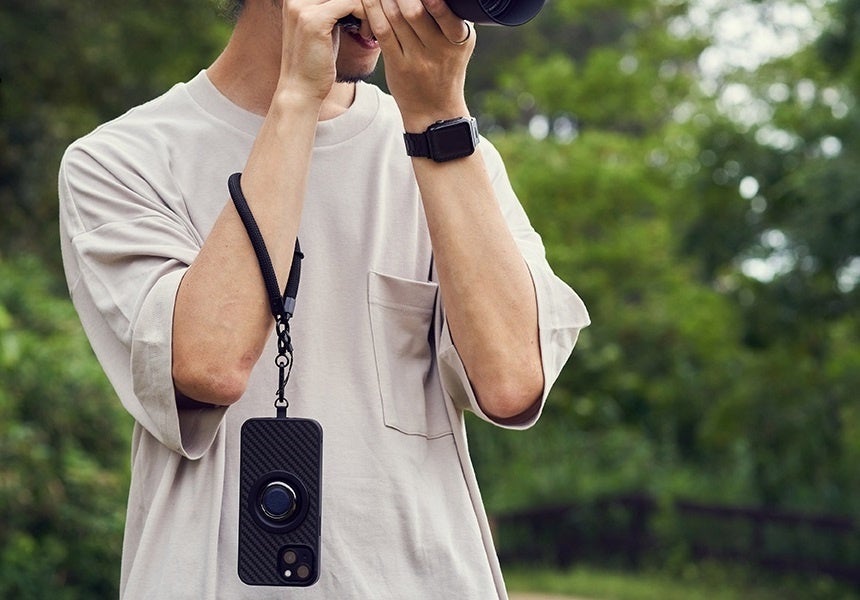 ストラップを使用しスマートフォンを首掛けや斜めがけ、手首にかける際の「長時間使用時の体への食い込み」を防ぎ、一カ所にかかる負担を和らげることを考慮した設計となります。また無骨な見た目に反し、ストラップはしなやかにフィットし、クッション性も有り。