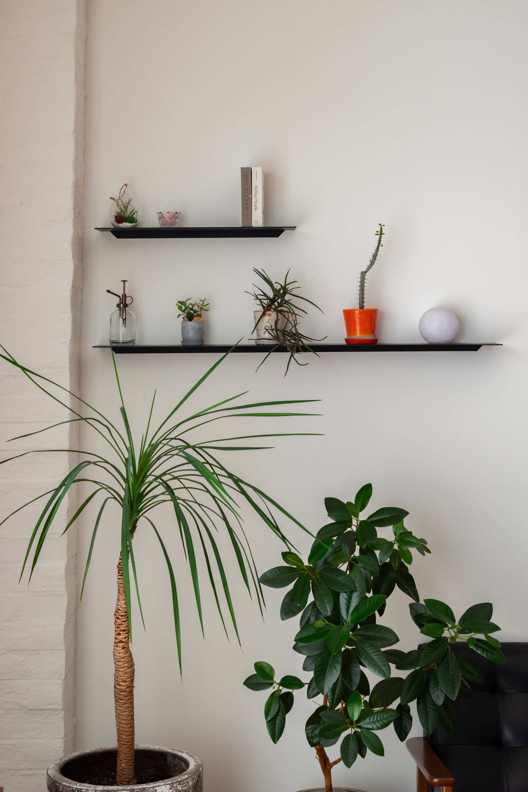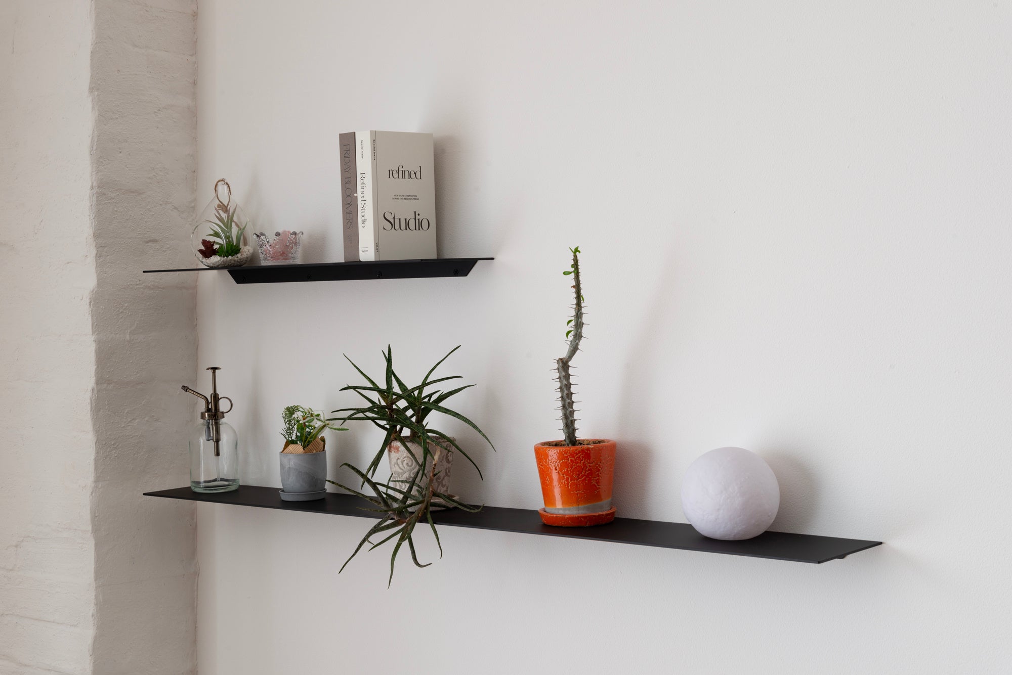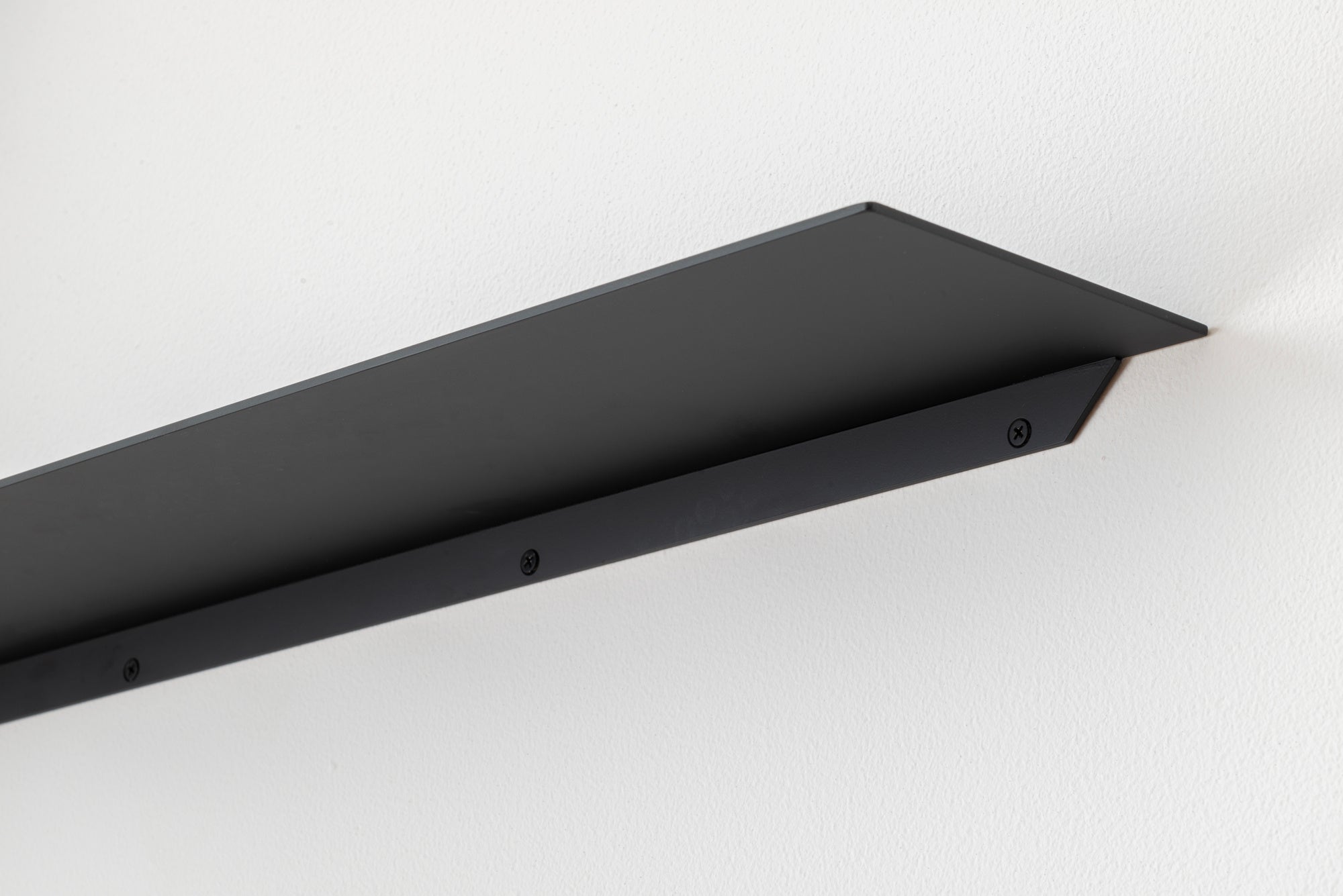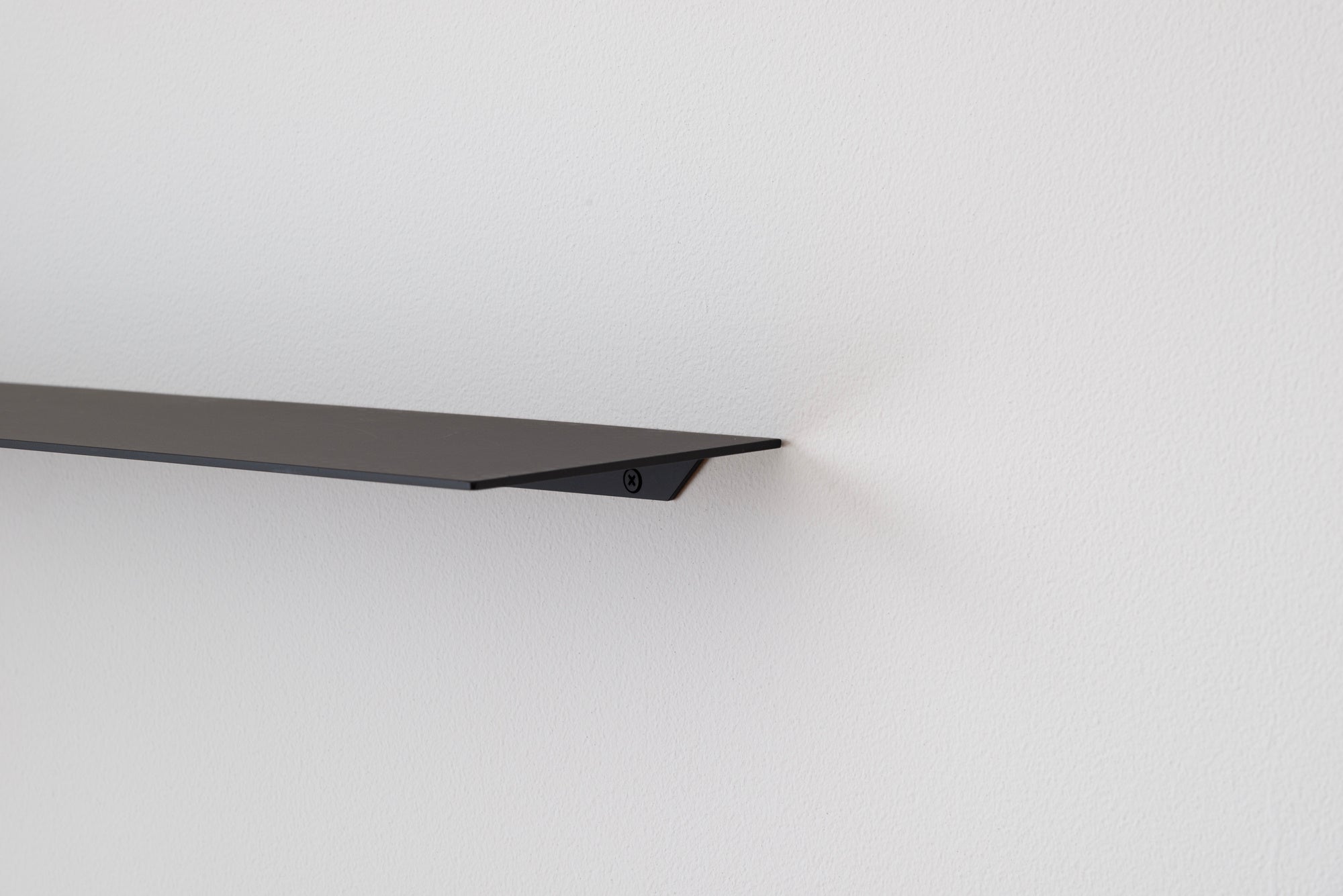 シェルフ自体が主張することなく、空間に馴染むことが最大の特徴である『STELF』。無駄な装飾がないからこそ、角部の絶妙なR や塗装の滑らかさ等、細部の仕上がりにこだわりました。固定部は両端部を30mm セットバックさせることで、極力目立たないように配慮されています。