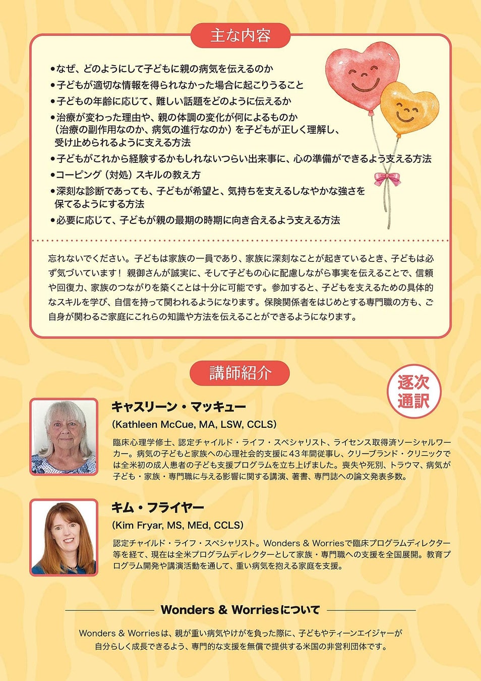 親が重い病気と診断されると、家族は大きなストレスに直面します。そのなかで子どもたちは、自身の不安や悲しみを後回しにされがちで、状況に応じた十分な配慮や精神的なサポートを受けられないことが少なくありません。このフォーラムは、米国のWonders & Worriesから、病気の子どもと家族への心理社会的支援の第一人者であるキャスリーン・マッキュー(Kathleen McCue, MA, LSW, CCLS)氏らをお招きし、ご登壇いただきます。