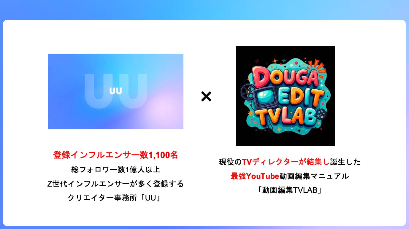 株式会社Suu(代表取締役:安藤鈴菜)運営のクリエイター事務所「UU」は、この度、動画編集スクール「動画編集TVLAB」との連携のもと、インフルエンサー向けの画期的なサービス「TV専門エージェント」 UUTVを開始いたします。