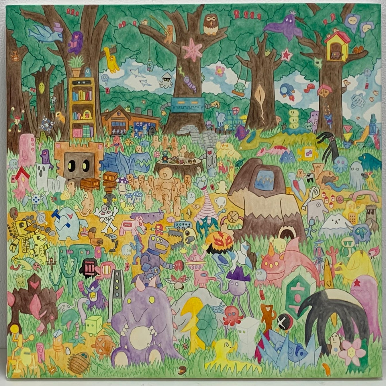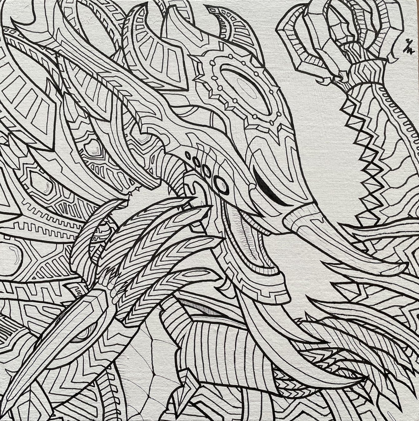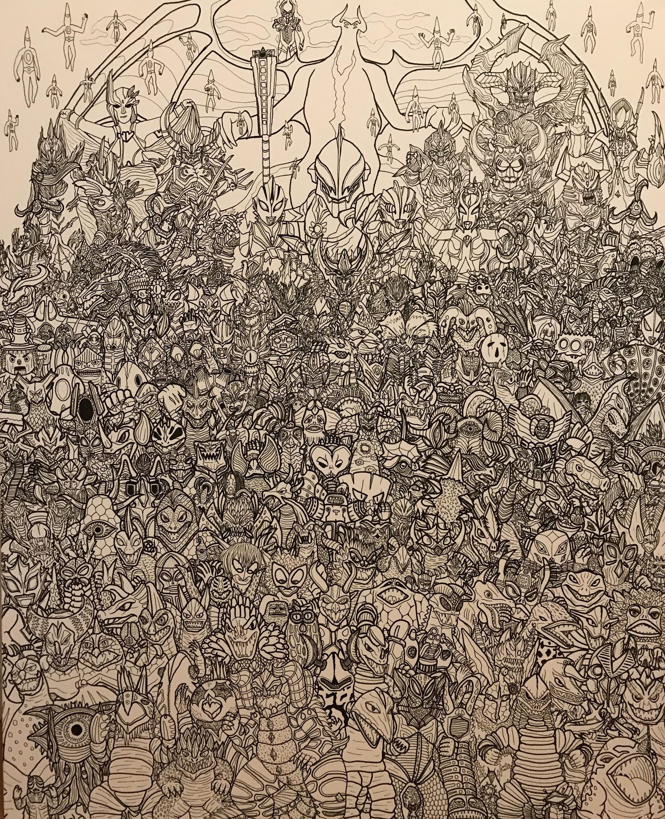家で過ごす時間の大半は絵を描いていた子供時代の八木さん。はじめは父親が仕事で使った書類の裏面に下書きもせず黒ボールペンで描きはじめ、紙が足りなくなったらセロハンテープで紙を継ぎ足して描いていました。ある時からウルトラマンに熱中して怪獣などの模写を始め、そのうちに独自で考案した怪獣やロボットなどを描くようになり、1枚の紙を怪獣で埋め尽くすような現在の作風が生まれるようになりました。