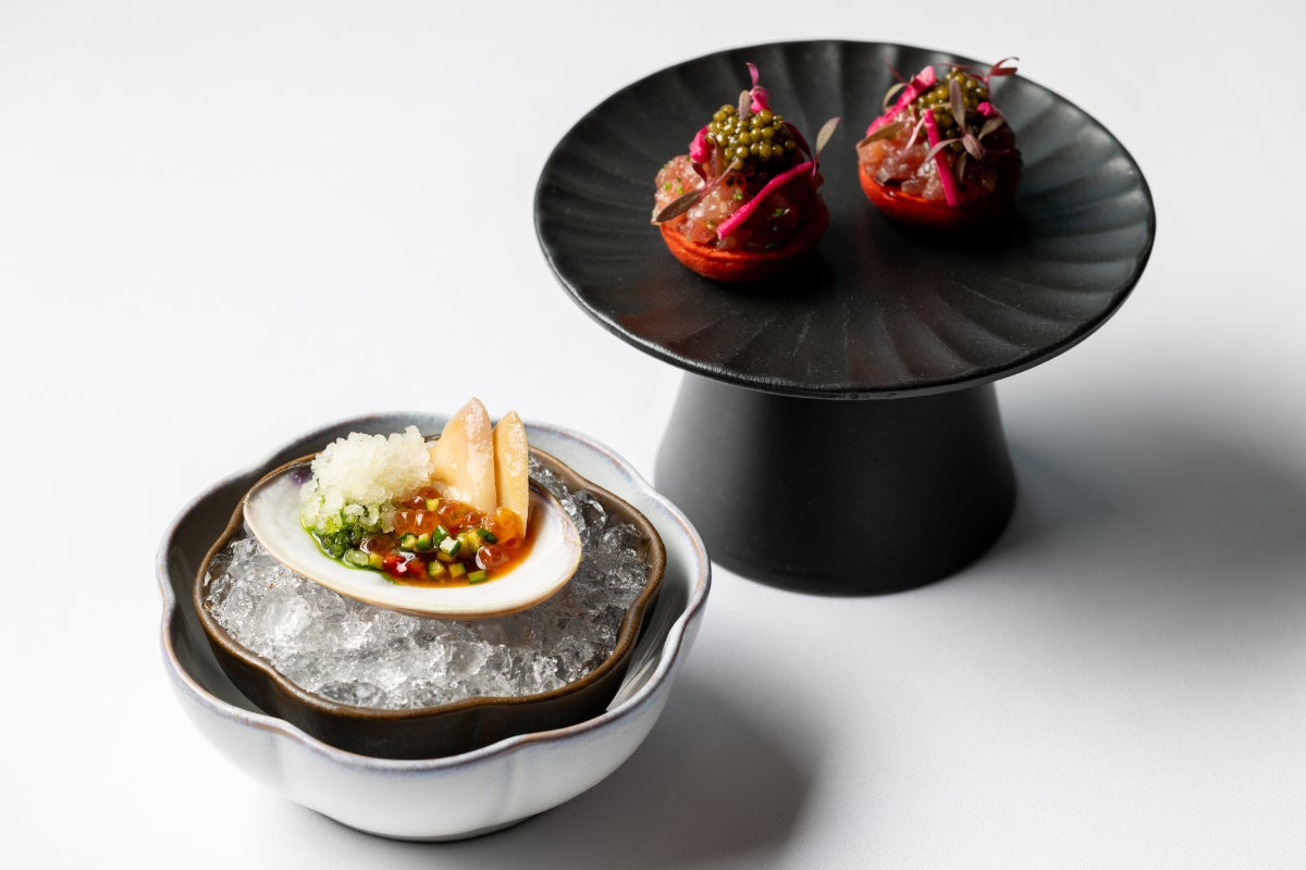 コースの幕開けを飾るのは、町田氏による「白子のロワイヤル」。濃厚な本白子のフランにカフィアライムで香りづけした蟹の餡を重ね、キャラメリゼした国産魚醤を添えた一皿は、西洋の技法に和の旨味を重ねることで“日本でしか表現できない深み”を追求しています。続いて登場するのは、シェフ デニスが手掛ける「オマール海老のラビオリ」。オマール海老やつぶ貝など海の幸に、スパイシーなンドゥイヤとグアンチャーレの熟成された旨味を加え、すし酢を使用した昆布ベースの和風出汁をアクセントにしたシェフこだわりの一品です。さらに町田氏の「甘鯛の松笠焼き」は、鱗付きのまま揚げた甘鯛に、百合根とホタテのペースト、白味噌とサワークリームのソースを合わせた、和の技法と洋の発想が融合する一皿。香ばしい食感、優しい甘みとほのかな酸味が織りなす絶妙なバランスが、秋の味覚に驚きと新たな表情を与えます。メインディッシュには、両シェフが共作する「和牛のウェリントン仕立て」が登場。竹炭を練り込んだ黒いパイ生地に包まれた柔らかい和牛に、赤玉ねぎと赤ワインの色鮮やかなソースを添えた逸品は、視覚と味覚に鮮烈な印象を残す、独創的かつ洗練されたフィナーレです。ジャンルや国境を越えて交差する感性が紡ぎ出す、2日間限定の唯一無二のガストロノミー体験を、この機会にぜひご堪能ください。