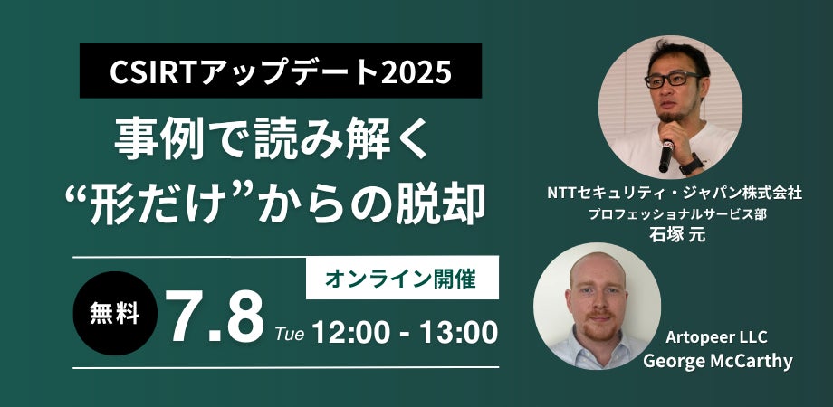 NTTセキュリティ・ジャパン株式会社(本社:東京都、代表取締役社長:関根 太郎、以下 NTTセキュリティ・ジャパン)は、2025年7月8日(火)に合同会社アートピア(本社:東京都、代表取締役:堀居 隆生、以下アートピア)と、「CSIRTアップデート2025~事例で読み解く”形だけ”からの脱却」セミナーを共同開催します。