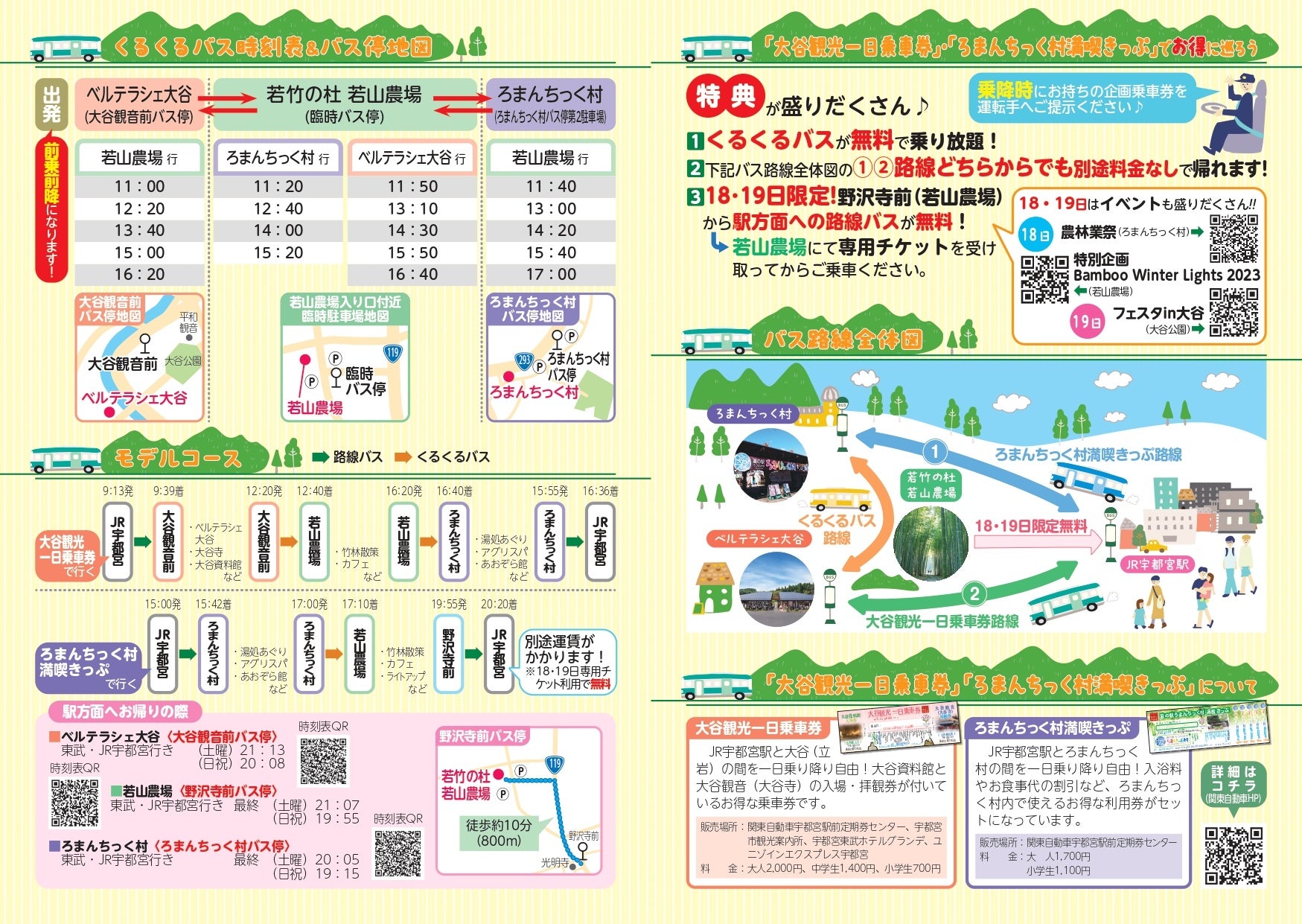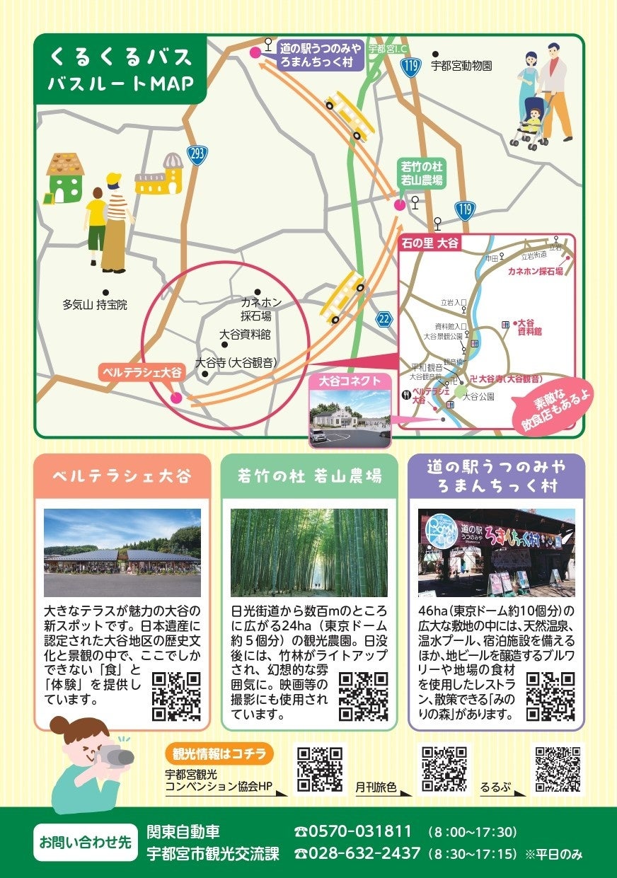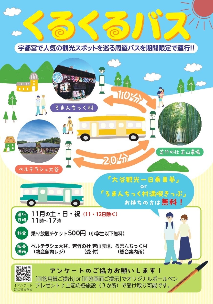 市内周遊促進と滞在時間の増加を図るため,ベルテラシェ大谷・若竹の杜 若山農場・道の駅うつのみや ろまんちっく村を結ぶ周遊バス「くるくるバス」を運行します。
