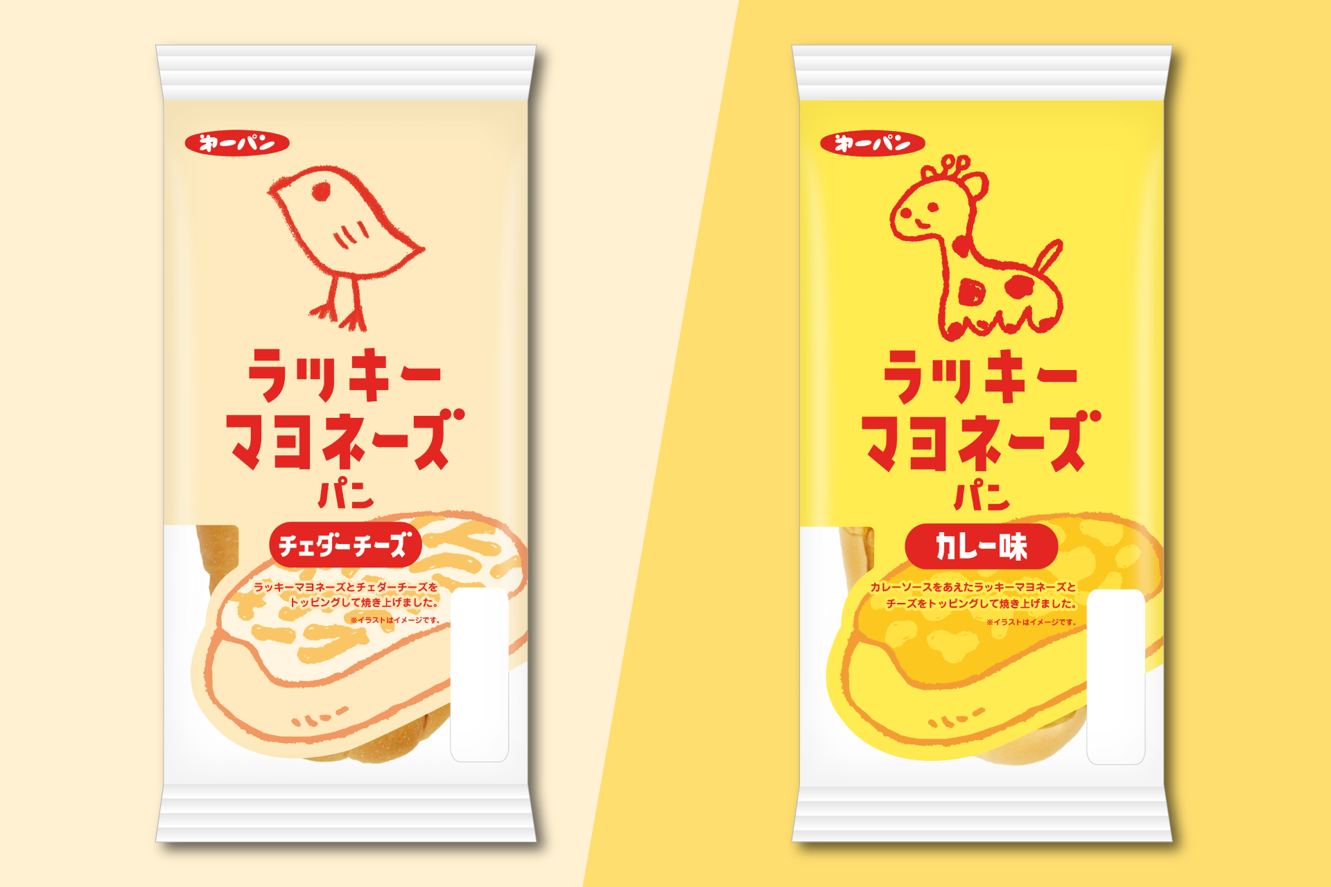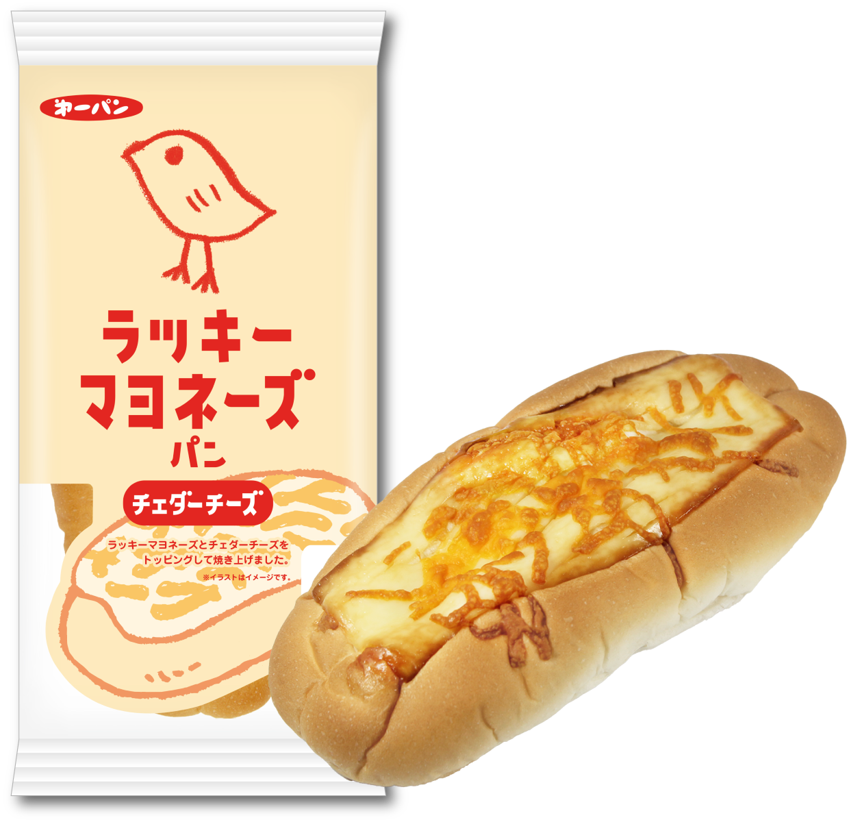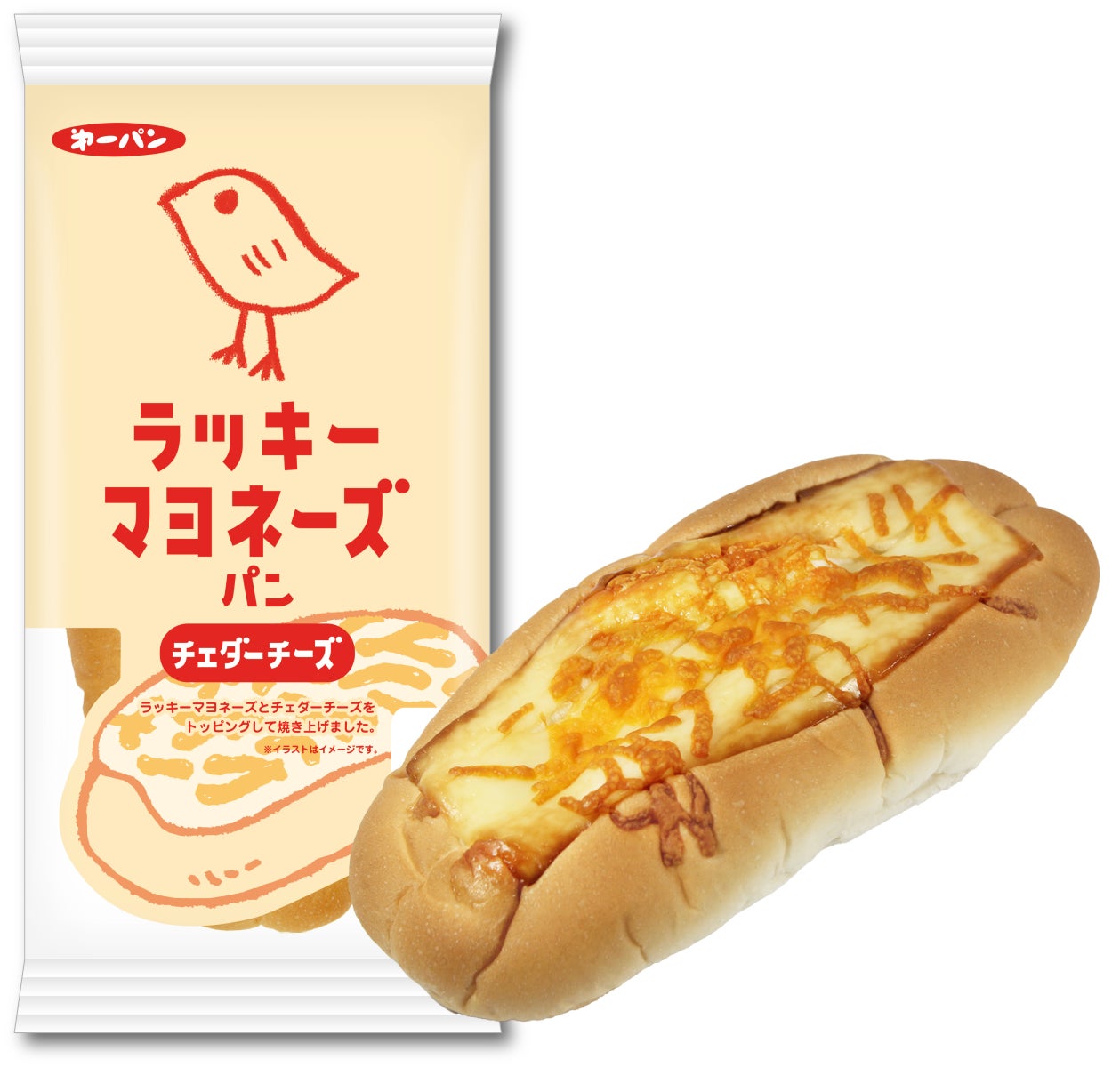 「ラッキーマヨネーズおかき」でお馴染みのひよこのイラストと、パンのイラストをデザインしたゆるかわいいパッケージです。