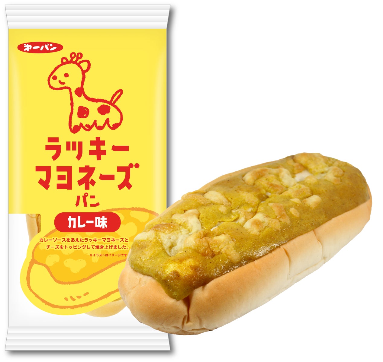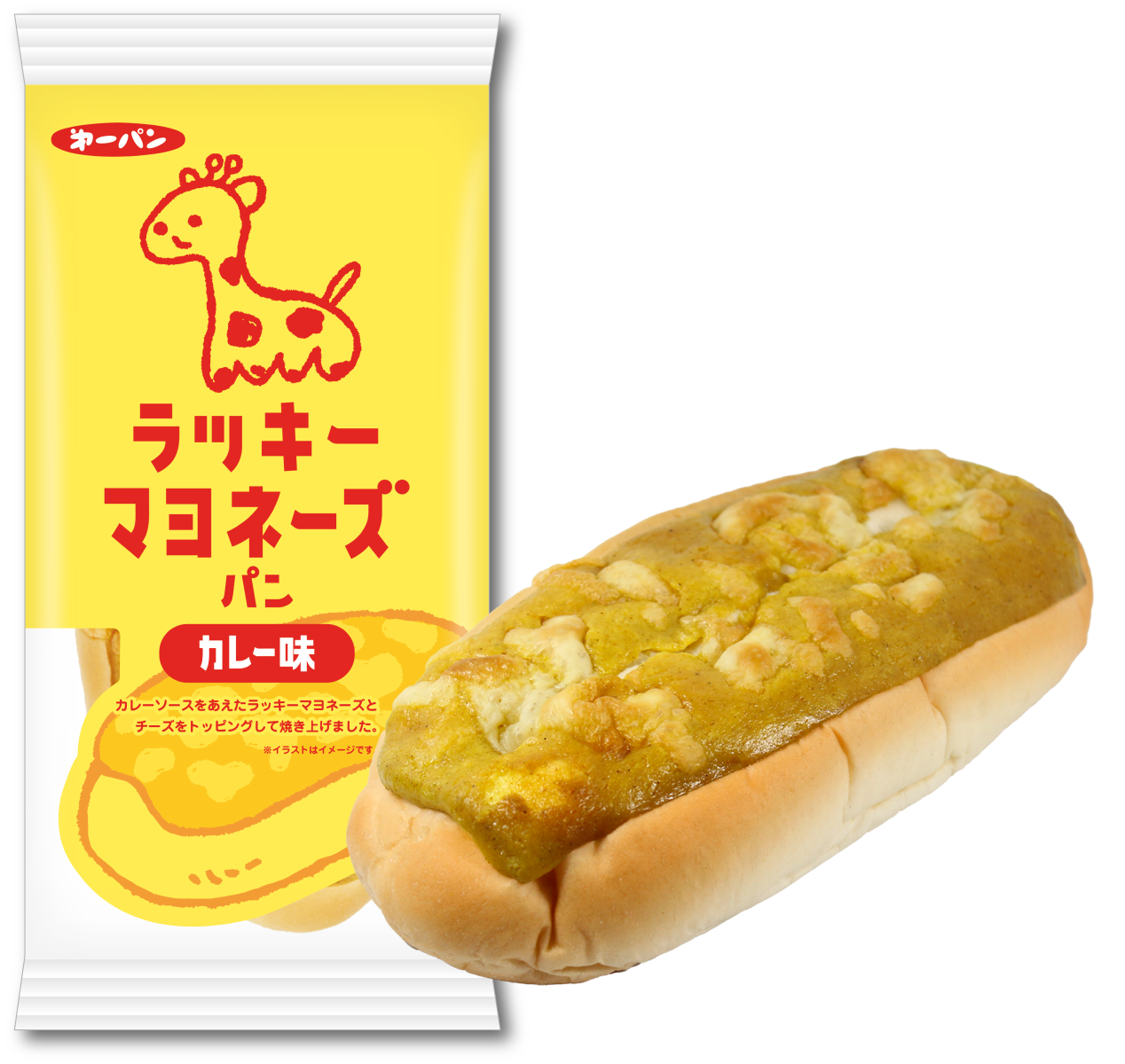 カレーソースをあえたラッキーマヨネーズとチーズをトッピングして焼き上げた、ボリュームのある惣菜パンです。「ラッキーマヨカレーおかき」を参考に、マヨ×カレー味に仕上げました。