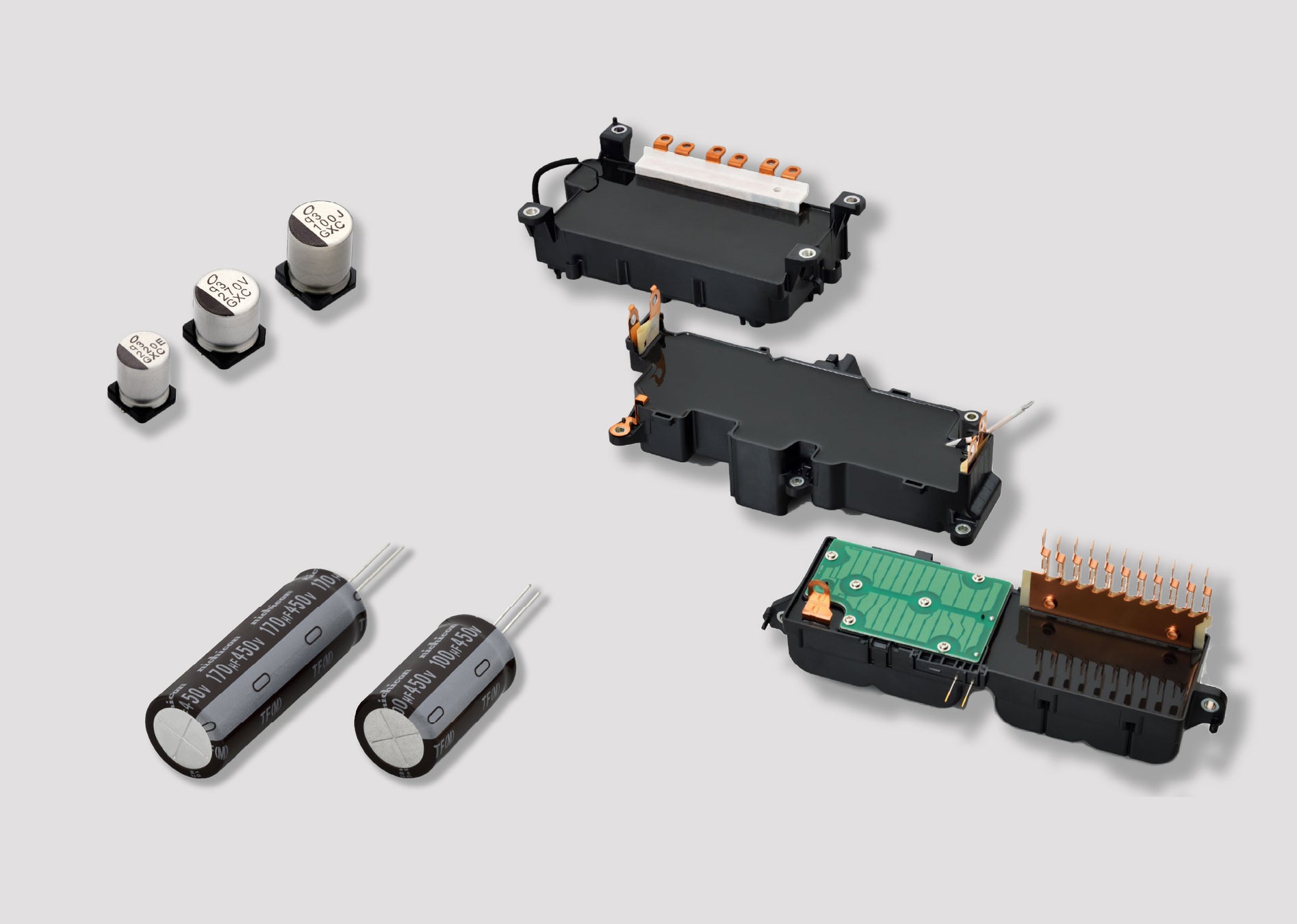 先進自動車に搭載される高信頼な導電性高分子ハイブリッドアルミ電解コンデンサやアルミ電解コンデンサ、xEV用フィルムコンデンサを紹介します。