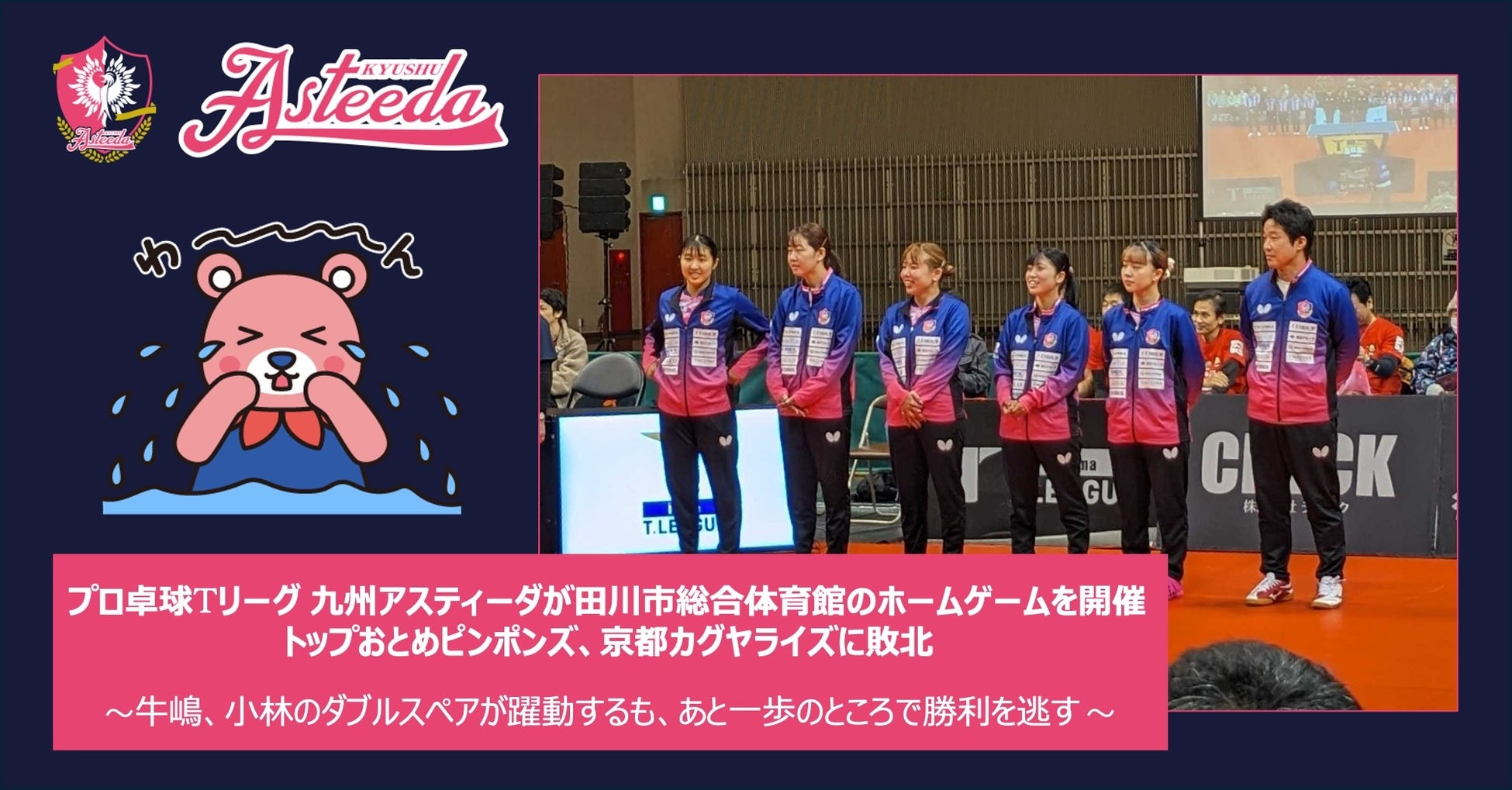 Tリーグ所属プロ卓球チーム「九州アスティーダ」を運営する「九州アスティーダ株式会社」(所在地:福岡県大野城市、代表取締役 川面 創 以下、当チームおよび、当社)は、2024年12月13日に田川市総合体育館にて開催されたホームマッチにて、トップおとめピンポンズ名古屋戦は 1 – 3 、京都カグヤライズ戦は1 – 3 にて敗北したことをお知らせします。
