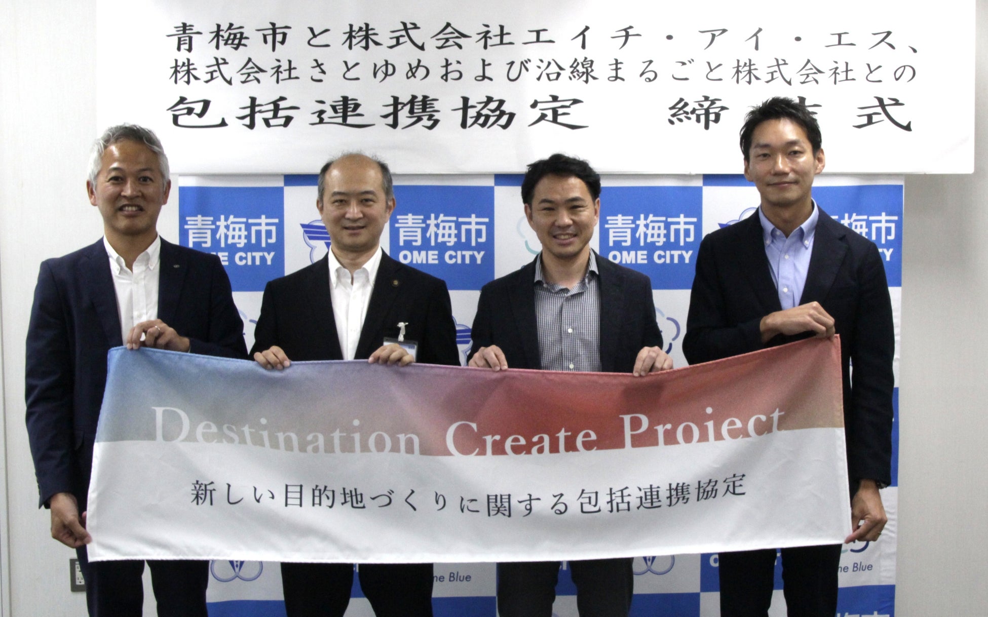 沿線まるごと株式会社(本社:東京都西多摩郡奥多摩町、代表取締役:嶋田 俊平、以下「沿線まるごと」)と、青梅市(市長:大勢待 利明)、株式会社さとゆめ(本社:東京都千代田区、代表取締役CEO:嶋田 俊平、以下「さとゆめ」)及び、株式会社エイチ・アイ・エス(本社:東京都港区、代表取締役社長:矢田 素史、以下「HIS」)は、「新・目的地創出事業-Destination Create Project-」(以下「DCP」)(※1)に関する包括連携協定を締結しました。