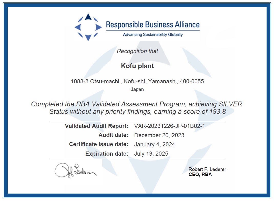 NECプラットフォームズ甲府事業所は、全世界で233社が加盟するグローバル・サプライチェーンにおける責任ある企業行動を推進する企業同盟RBA(注1)から認証を取得しました。