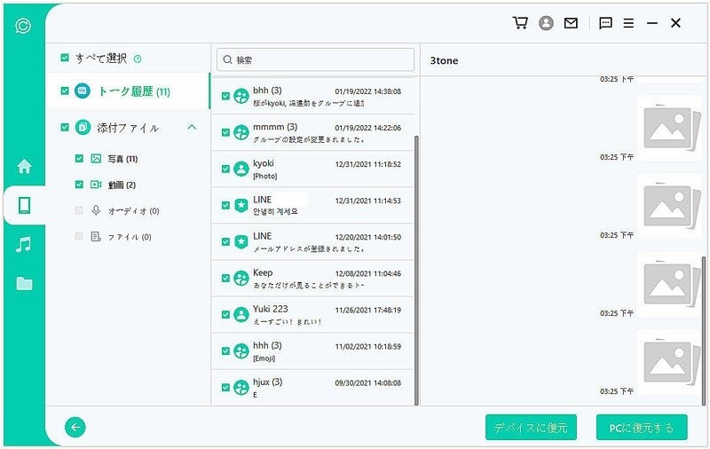 Chatsback for LINEは紛失 / 削除されたLINEトークと添付ファイルをiOS / Androidデバイス、iTunes/ iCloudバックアップから直接復元できるソフトです。iPhoneとAndroidのほぼすべてのデバイスと互換性があり、たったワンクリックするだけでLINEの誤削除、紛失されたトーク履歴、Keep、写真、ビデオ、添付ファイルをプレビューしてからデバイス、PCまで復元できます。