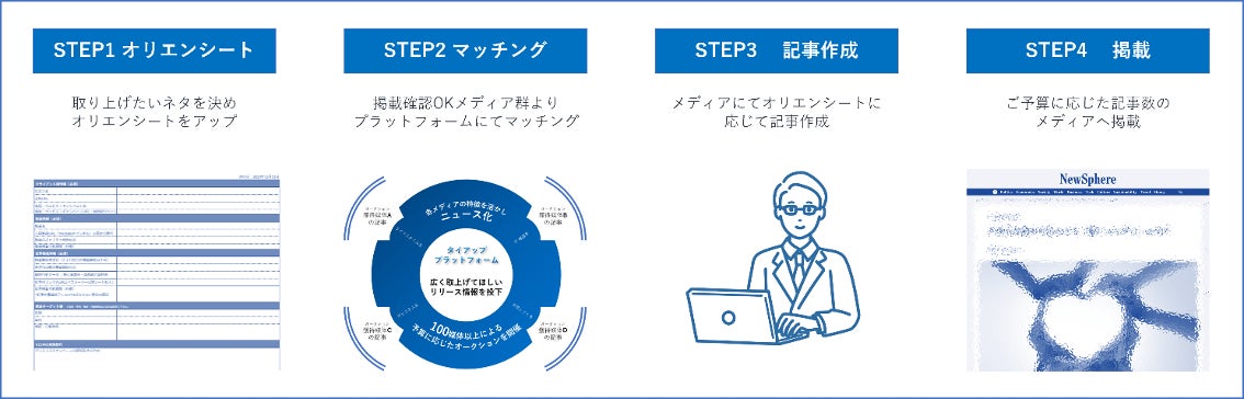 予算を抑えながら効率よく広告出稿を実施したい事業会社のマーケティングや広告の担当者に最適です。オリエンシートに記入し、メディアとマッチングした後、プレスリリースや報道資料、画像などの各種データをご入稿いただきます。その後、メディアにて記事を作成、掲載いたします。