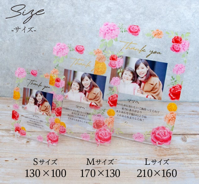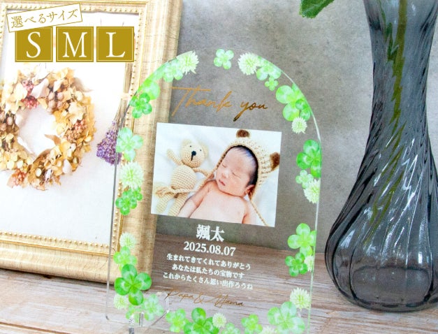 透明アクリルに写真と花柄をプリントし、タイトルには金箔を使用。形は四角または丸から選べ、花柄も6種類から選べるカスタマイズが可能です。