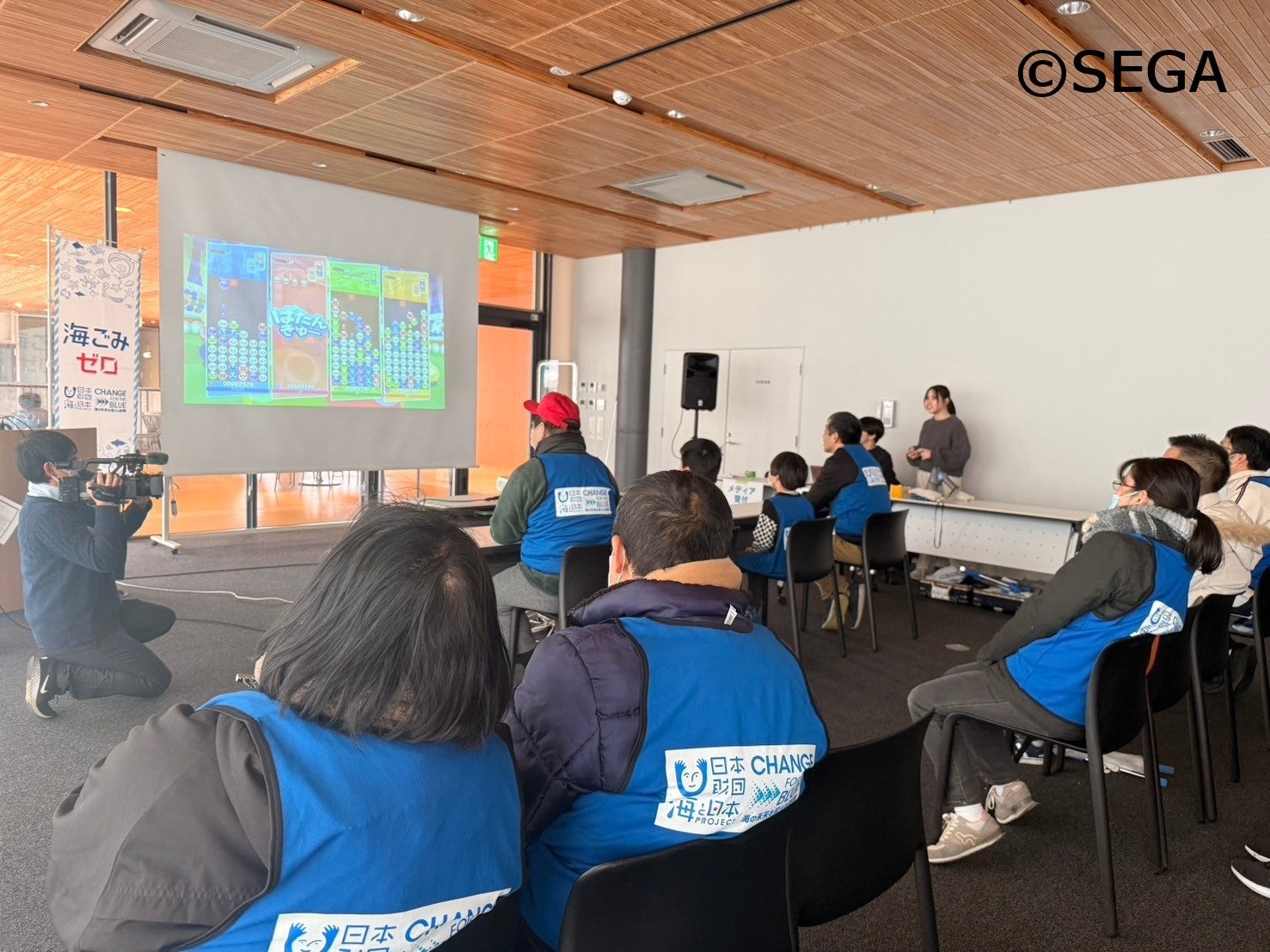 eスポGOMIでは、ごみ拾い前半戦と後半戦の間のハーフタイムに「ゲーム大会」を行うのが見どころの一つ。今回はゲームタイトル「ぷよぷよeスポーツ」でゲーム大会を行い、実況の声もあって会場は大いに盛り上がりました。