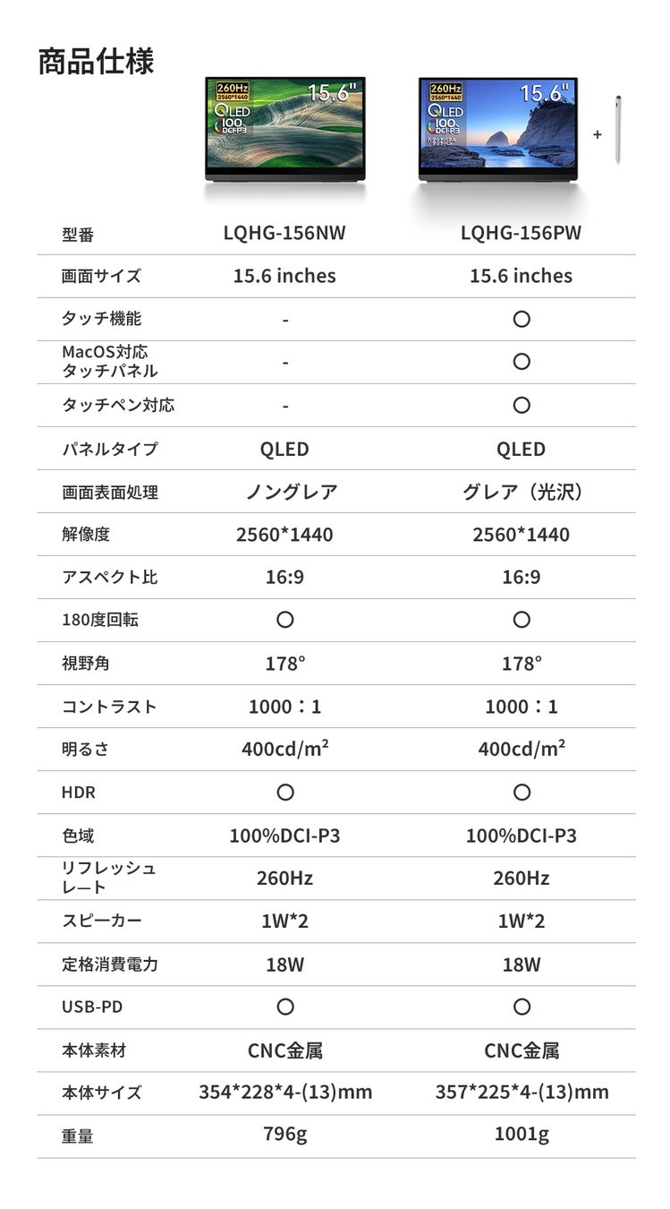 QLEDパネル/15.6インチ /2K解像度/HDR・広色域