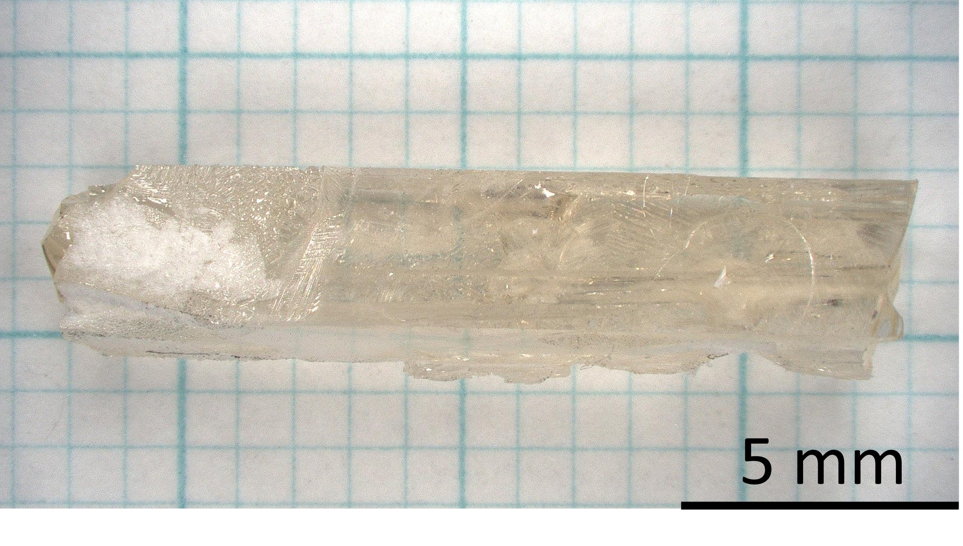 今回、Patentix株式会社は約15 mmのr-GeO2のバルク結晶の合成に成功しました(図1)。