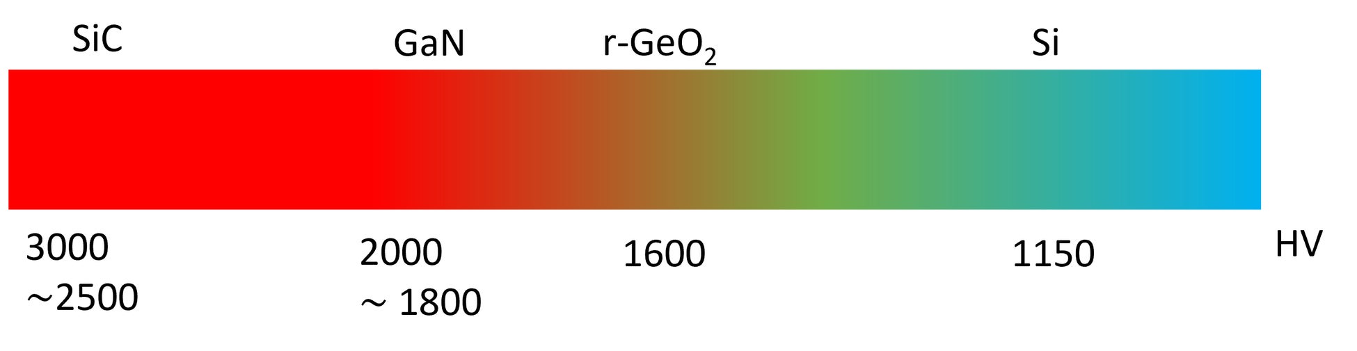 r-GeO2バルク結晶(110)面に対しビッカース硬度測定を行ったところ、約1610 HVであることが確認されました。1610 HVという値はSi(1150 HV)より硬く、SiC(2500 ∼ 3000 HV)、GaN(1800 ∼ 2000)よりは柔らかいことを示しています(図3)。そのため、r-GeO2は比較的加工性に優れた材料であるといえます。