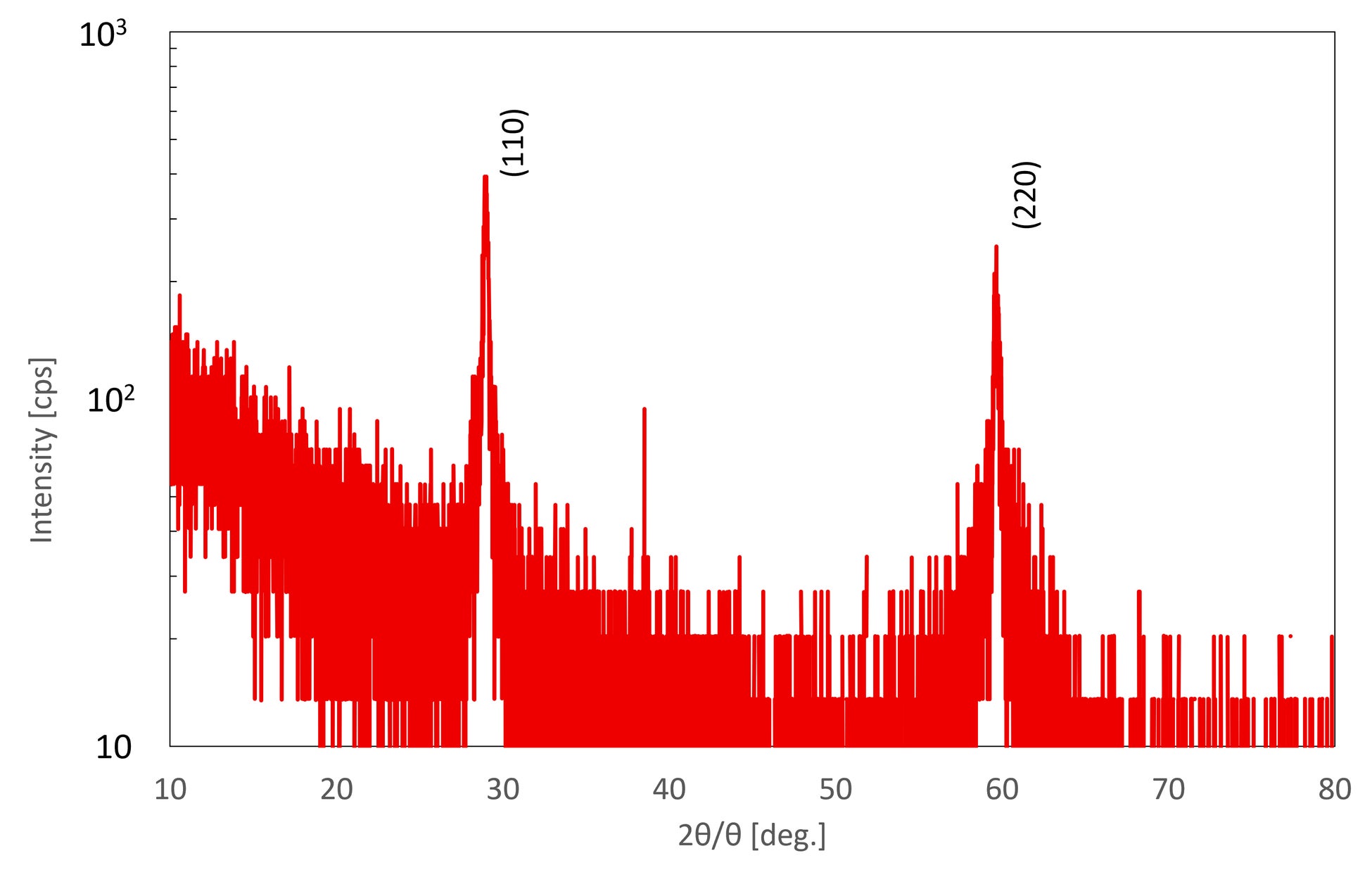 結晶を粉末状にし、X線回折法で構造評価したところほとんどのピークがr-GeO2に由来するものであると確認されました。r-GeO2の結晶のファセット面をX線回折法で評価したところ、ファセット面は(110)面であることが確認されました(図2)。