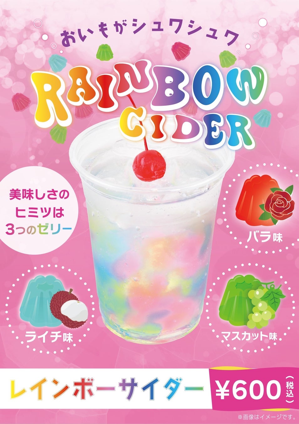 3種のレインボーゼリーの爽やかな香りと、お芋のサイダーが楽しめる贅沢な味わいのレインボーサイダー