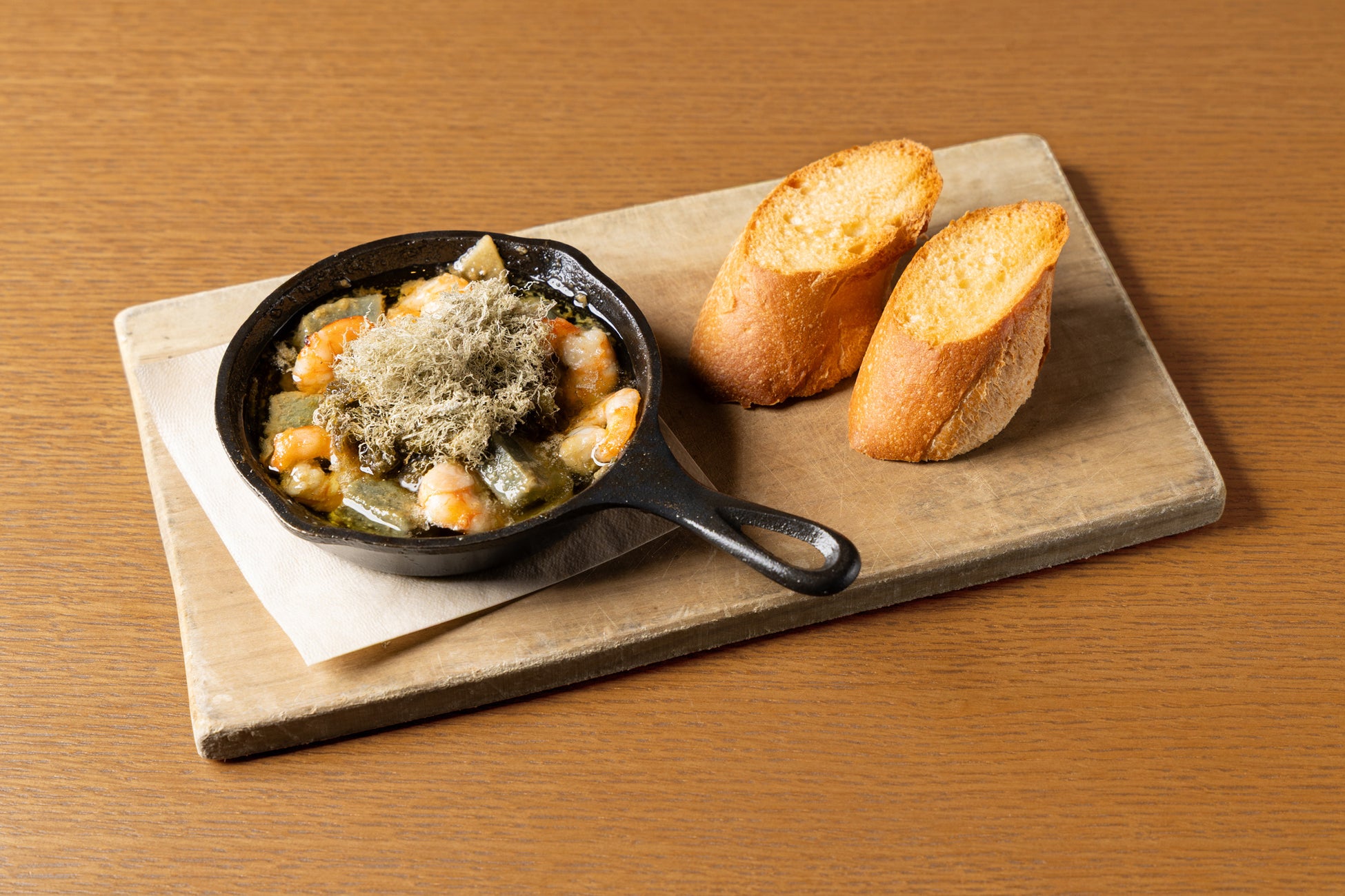 ・メニュー名: よもぎ麩と小エビ とろろ昆布のアヒージョ ・価格: 1,000円(税込) ・詳細:当時COPELANDとのペアリングでおすすめをしていたアヒージョのレシピに「和クラフト」要素を足して復活。半兵衛麩のよもぎ麩と、ぷりっとした小エビを使っており、とろろ昆布とへしこオイルが味のアクセントになっています! |