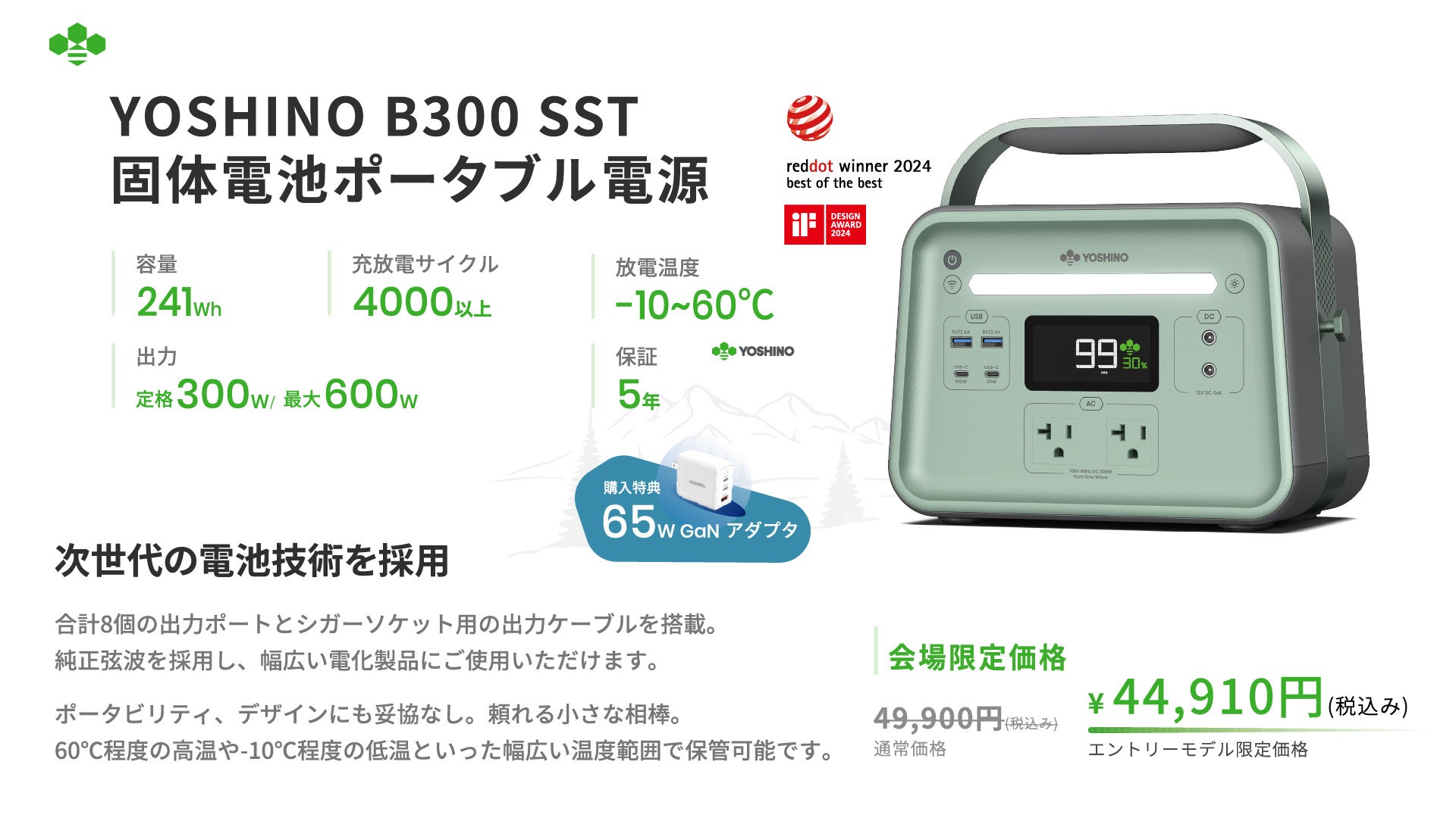 エントリーモデルのポータブル電源、B300 SSTについては会場限定価格のセールも実施。通常価格49,900円(税込み)のところ、10%オフの44,910円にて会場でご購入いただくことが可能です。容量241Wh、充放電サイクル4,000回以上を実現したポータブル電源B300 SSTを手軽に導入できるチャンスになっています。