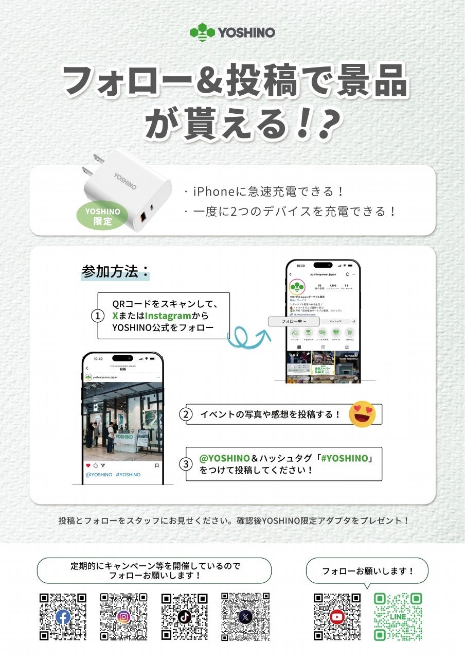 来場者限定で、iPhoneやAndroidスマートフォンを急速充電できるYOSHINOオリジナル2in1充電器をプレゼントするプレゼントキャンペーンも実施いたします。