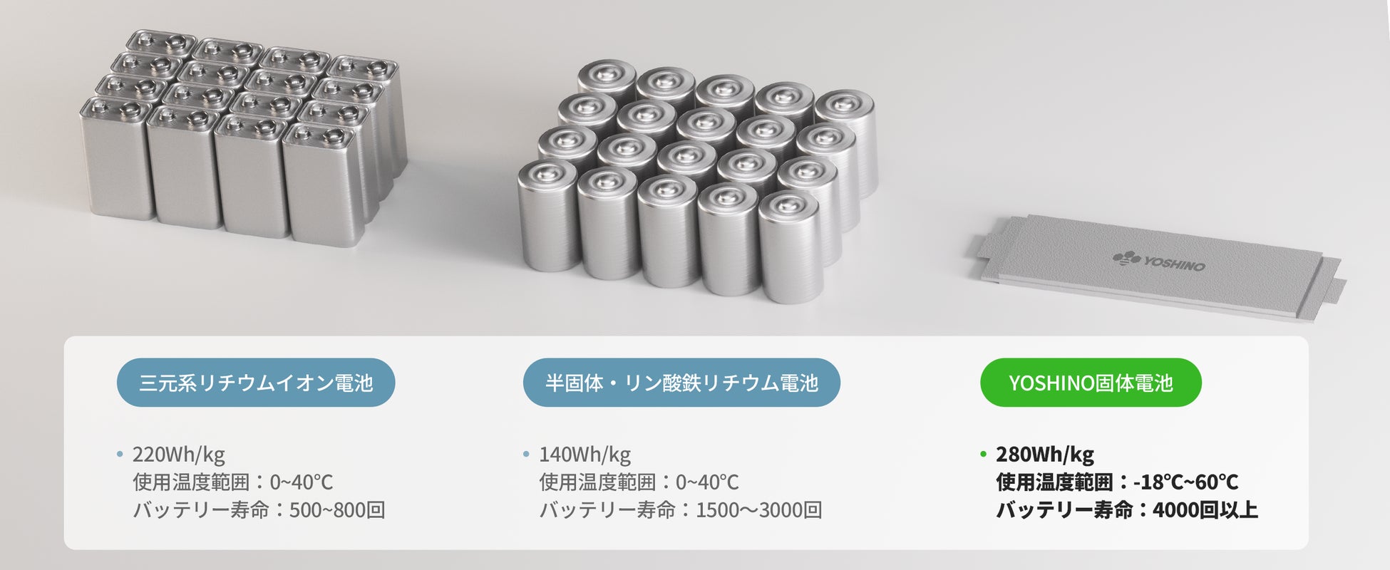 YOSHINOの固体電池は海外の高級電気自動車に採用されている固体電池を採用し、最大60℃の高温環境や-10℃といった低温下でも利用できる高い性能実現していることが特徴。固体電池は電池には必須となる電解質を固定化したもので、これまでのリン酸鉄リチウムイオン電池に比べて衝撃や熱に対しての高い安全性を確保。連続釘刺し試験や斧を用いた耐久性テストでも爆発や発熱しない絶対的な安全性を確保しました。