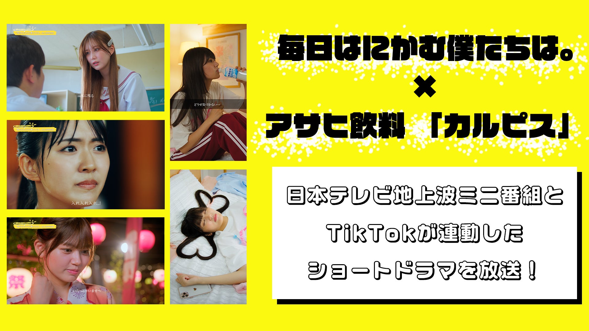 日本テレビ放送網株式会社(本社:東京都港区、代表取締役社長執行役員:石澤 顕、以下、日本テレビ)の公式ショートドラマ『毎日はにかむ僕たちは。』とアサヒ飲料株式会社(本社:東京、社長:米女太一、以下、アサヒ飲料)の『カルピス』がコラボし、TVとSNSを横断した試みとして、日本テレビミニ番組とTikTokが連動したショートドラマの放送をいたします。