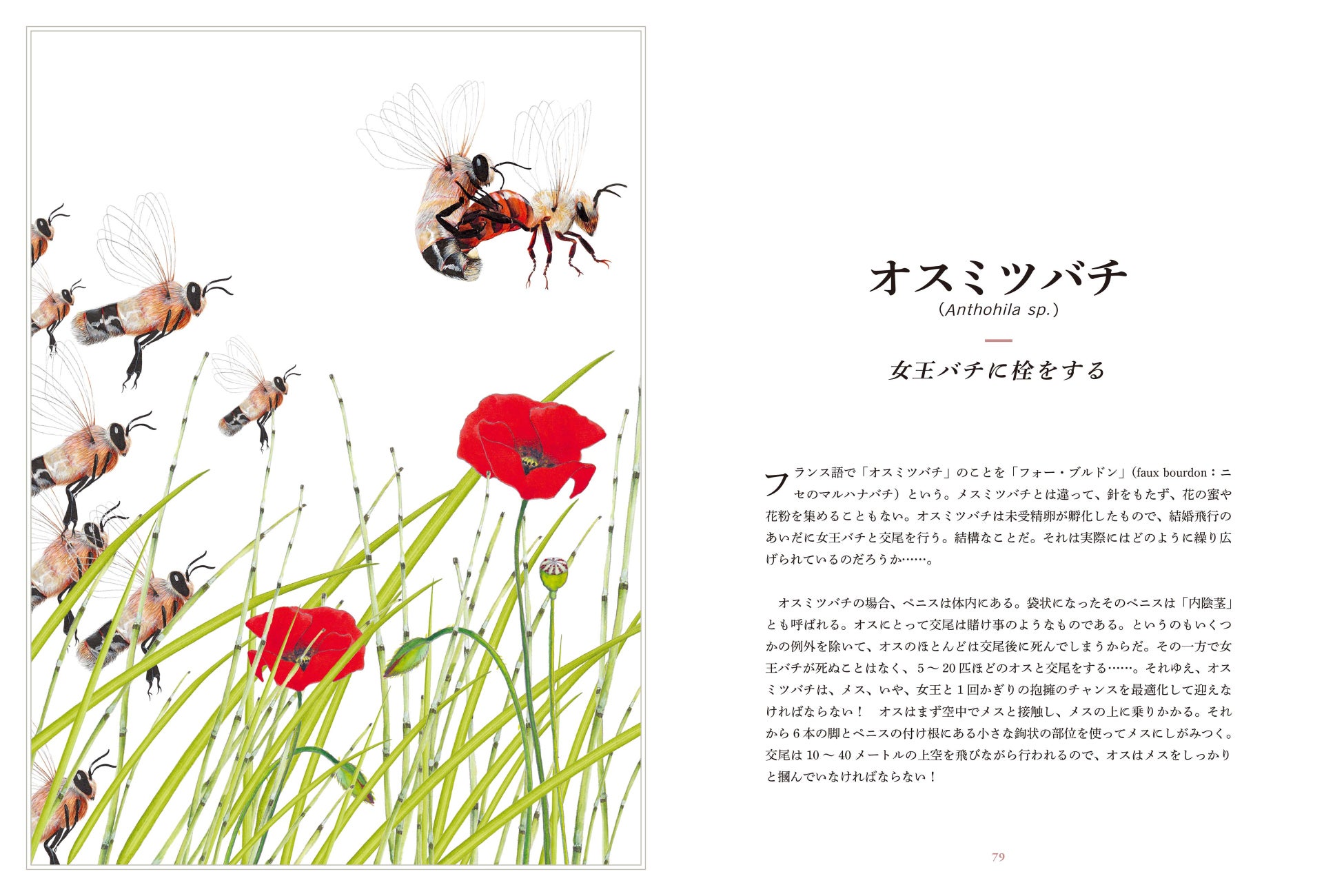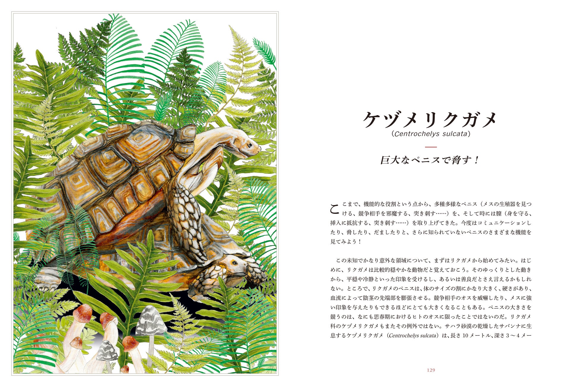 本書ではワニやダチョウ、カメレオン、ハリモグラ、ゾウ、ナメクジなど(果てはシラミまで!)、32種類の生物の生殖活動とオスの生殖器を紹介する。各生物は色彩豊かな水彩画と繊細な鉛筆画などが添えられ、美しさを堪能できる。しかし、と言うべきか、生物の大小に関わらず、その生殖の物語は驚きの連続だ。ふたつのペニス、先端が4つあるもの、自在に動き時には物を摑むもの、トゲだらけのもの、歌うもの(!)など、困難に適応するために辿り着いた形や大きさ、生殖方法には圧倒されるばかりだ。彼らの戦略と飽くなき情熱を前には、ヒトの営みはきわめて平凡なものに感じられるのは間違いない。