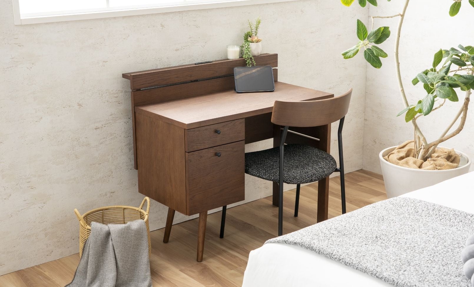 ベッドやナイトテーブルと並べれば、寝室に統一感のある空間をつくれる。