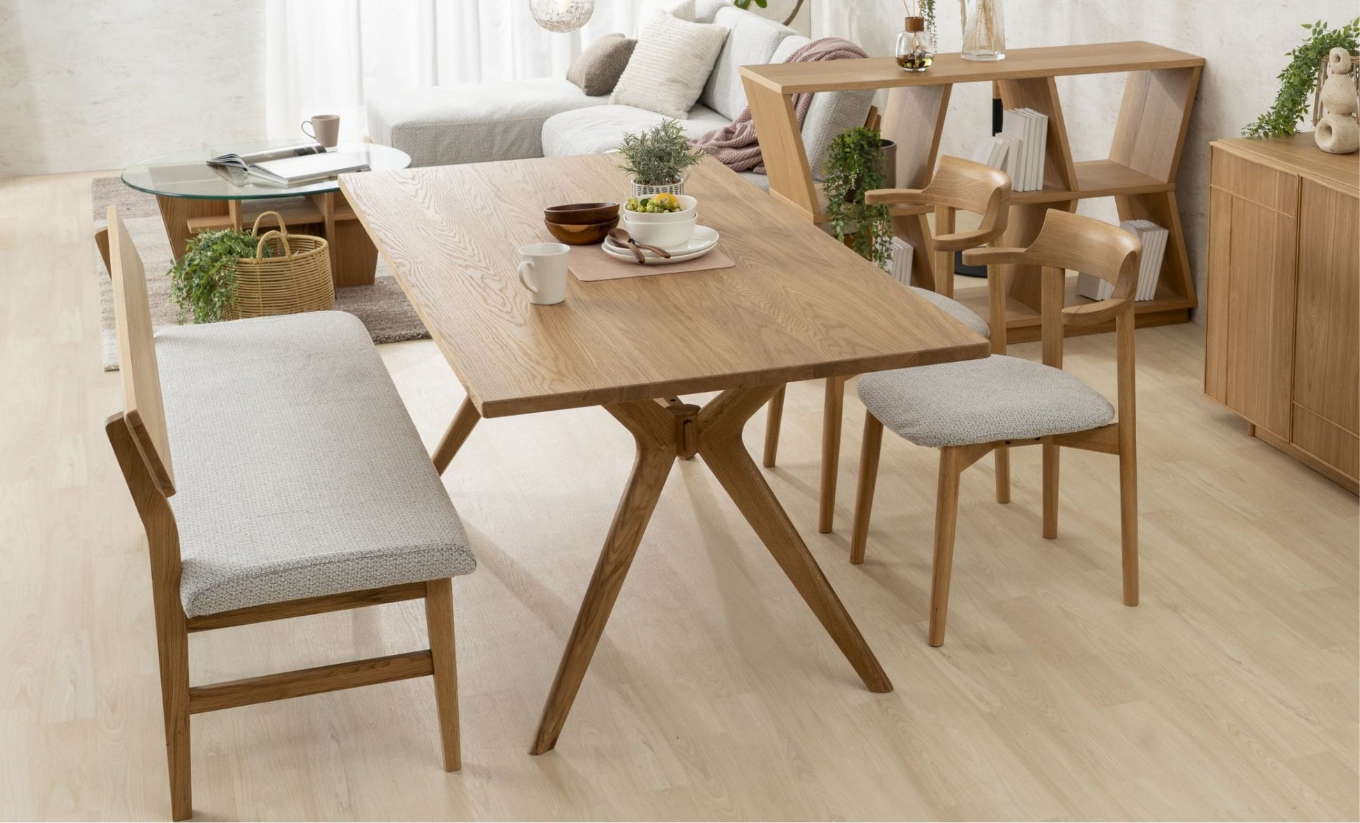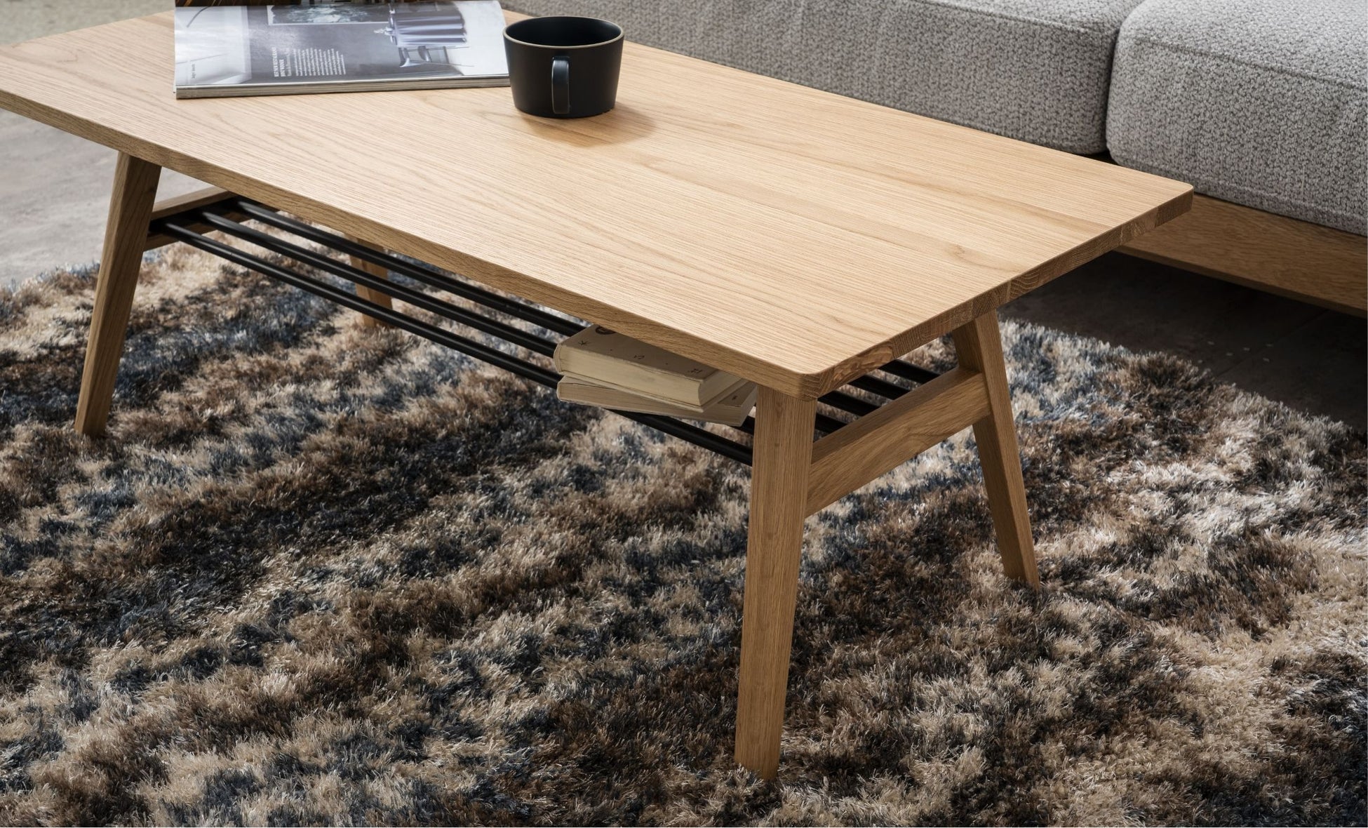 ホワイトオーク材の木フレームがアクセントとなったデザイン。背面まで使える収納スペースを設けることで実用性を高め、細身の黒スチール脚が軽やかな存在感をつくり、角には面取り加工を施し全体をやわらかな印象に整えた。