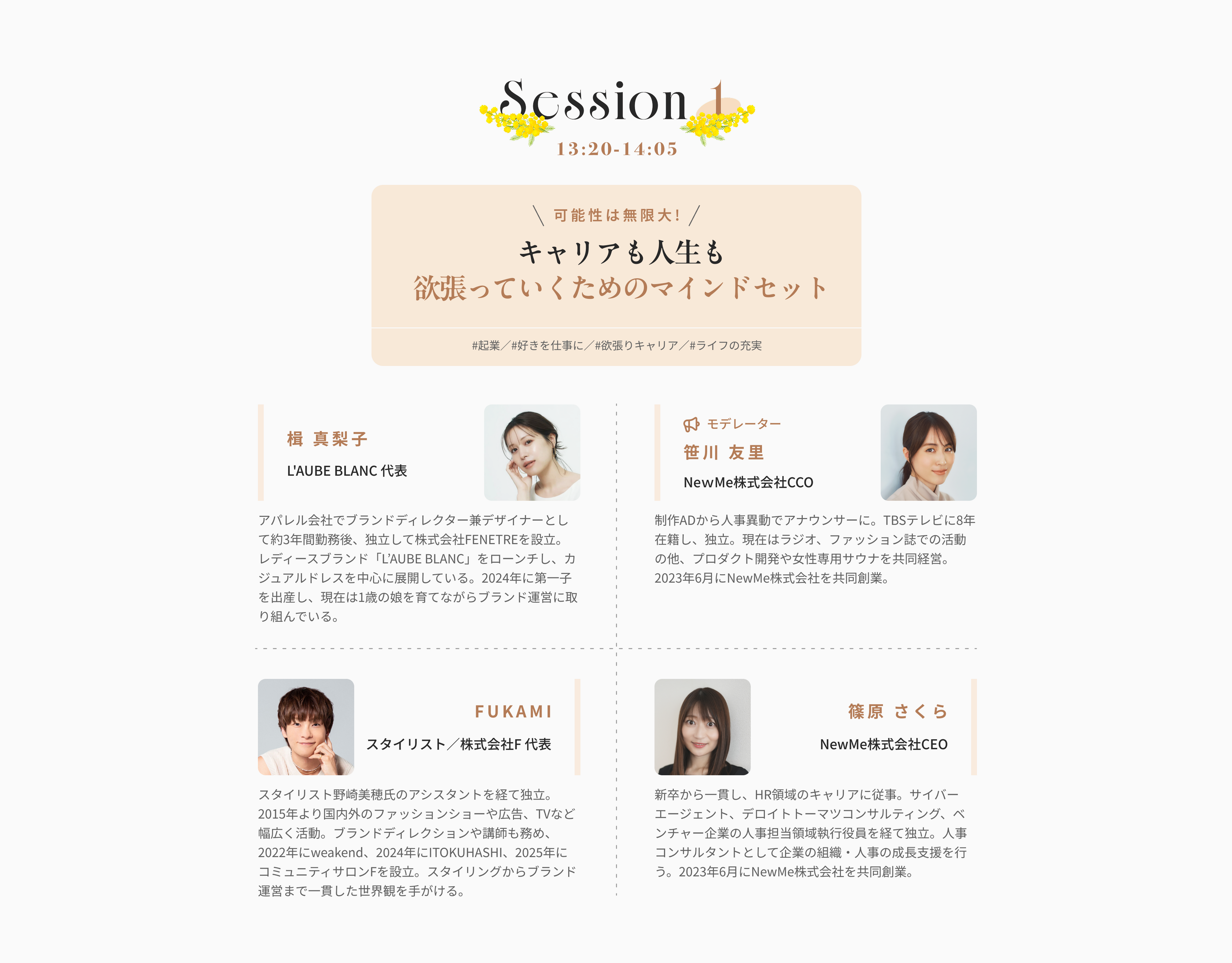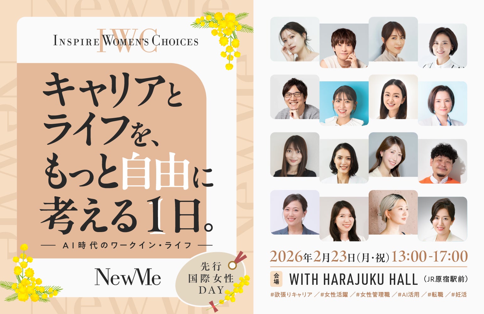 NewMe株式会社(本社:東京都渋谷区、代表取締役:篠原さくら/笹川友里、以下NewMe)は、国際女性デー(3月1週目)に先がけ、「Inspire Women’s Choices — キャリアとライフをもっと自由に考える1日 ~AI時代のワークイン・ライフ~」を2026年2月23日(月・祝)に開催いたします。 変化の大きい今の時代に、女性が“自分らしい選択”と出会い、キャリア・ライフを前進させるきっかけを提供することを目的としたイベントです。