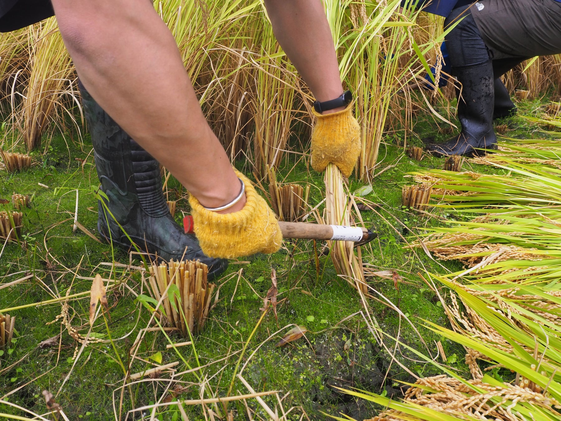 この収穫体験では、ひとつひとつ手で刈り取り、麻ひもで結んでいく昔ながらの手法で稲刈りを行います。