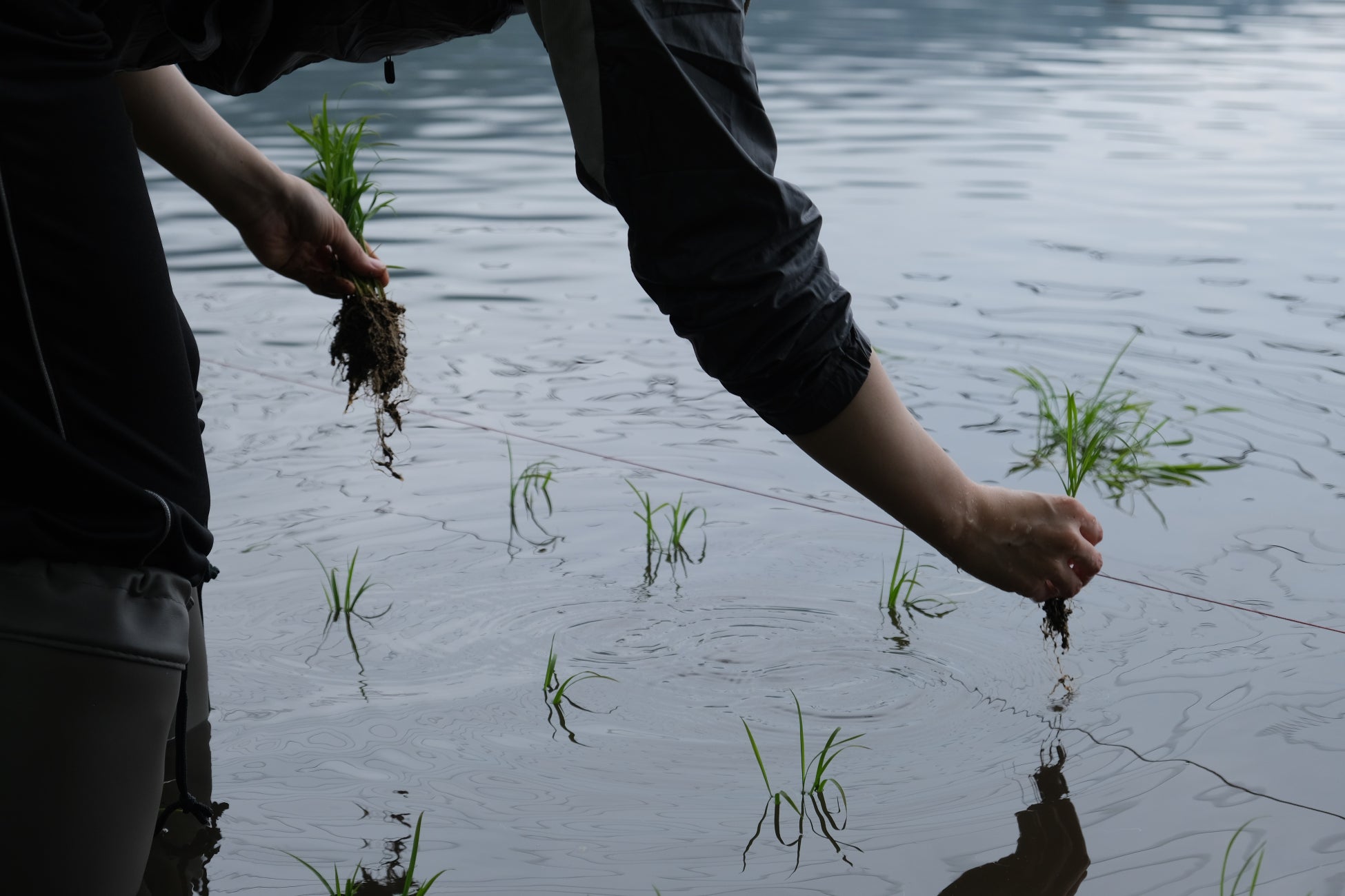 最初はうまく歩けず、バランスを崩すこともありますが、そのぎこちなさも次第に楽しくなっていきます。どこか、子どもの頃のどろんこ遊びを思い出すような時間です。 少しずつ前に進みながら、苗を一束ずつ植えていきます。