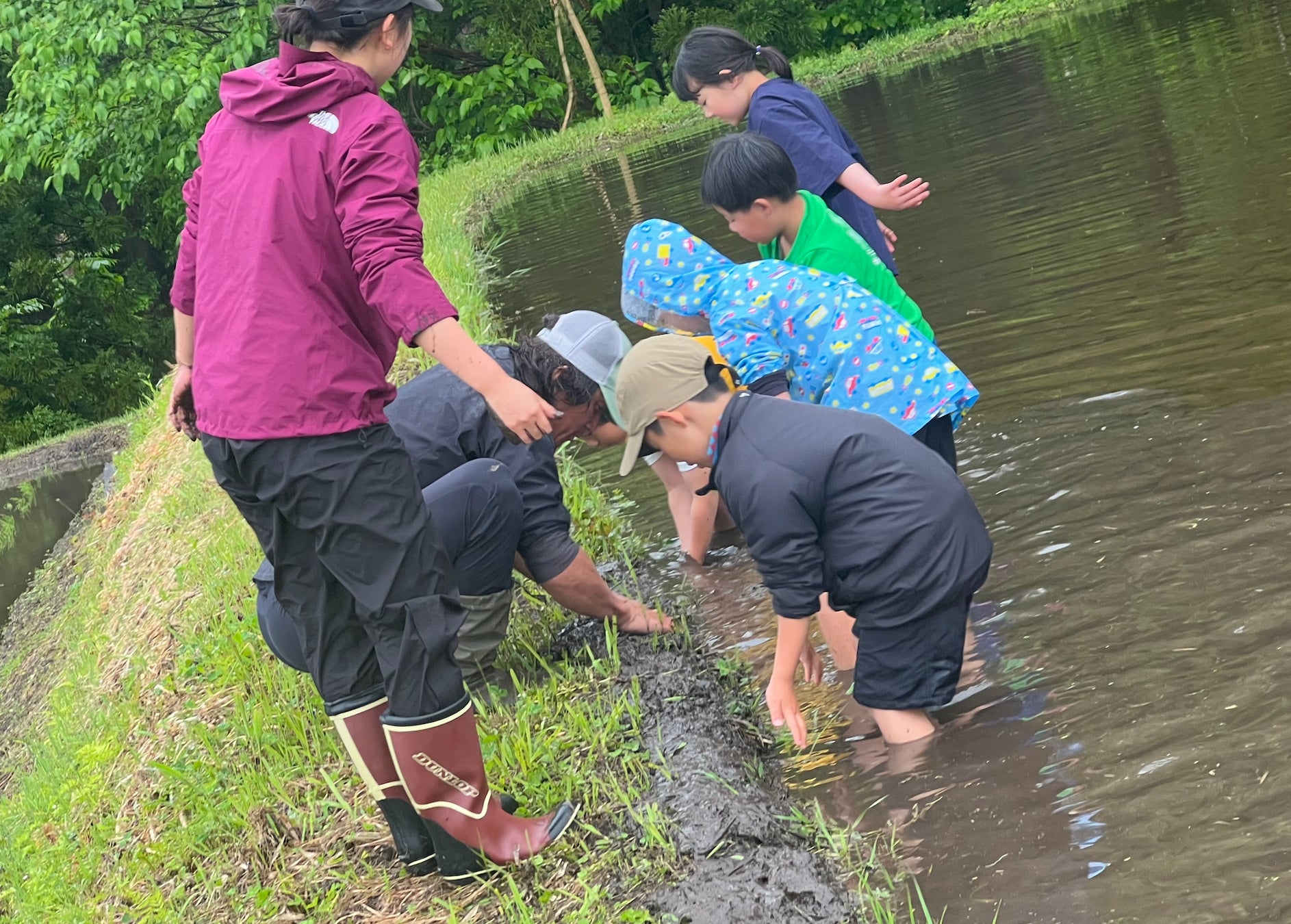 まっすぐ苗を植えることや、土手から苗を渡し合う作業では、初対面同士でも自然と声を掛け合いながら進んでいきます。協力し合うことの大切さを、子どもたちと一緒に体感できる時間です。