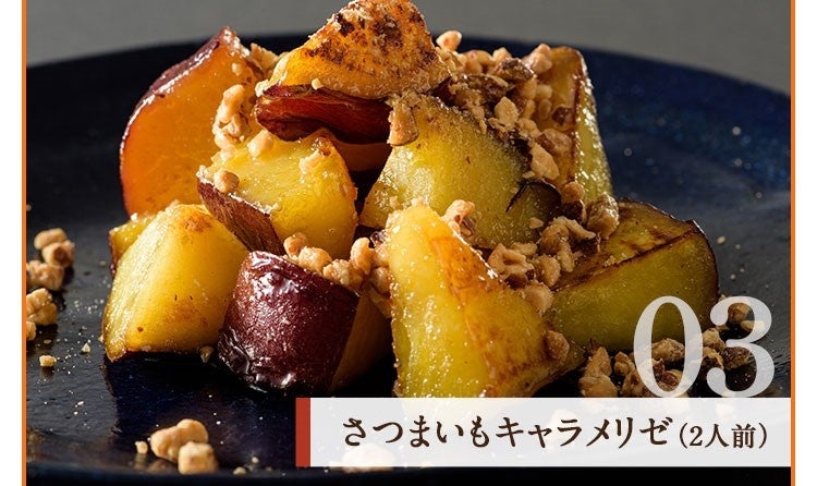 はちみつの甘さと塩のしょっぱさが後を引く大学芋です。さつまいもは加熱済みのため簡単に調理でき、キャラメルアーモンドが味と食感のアクセントになっています。