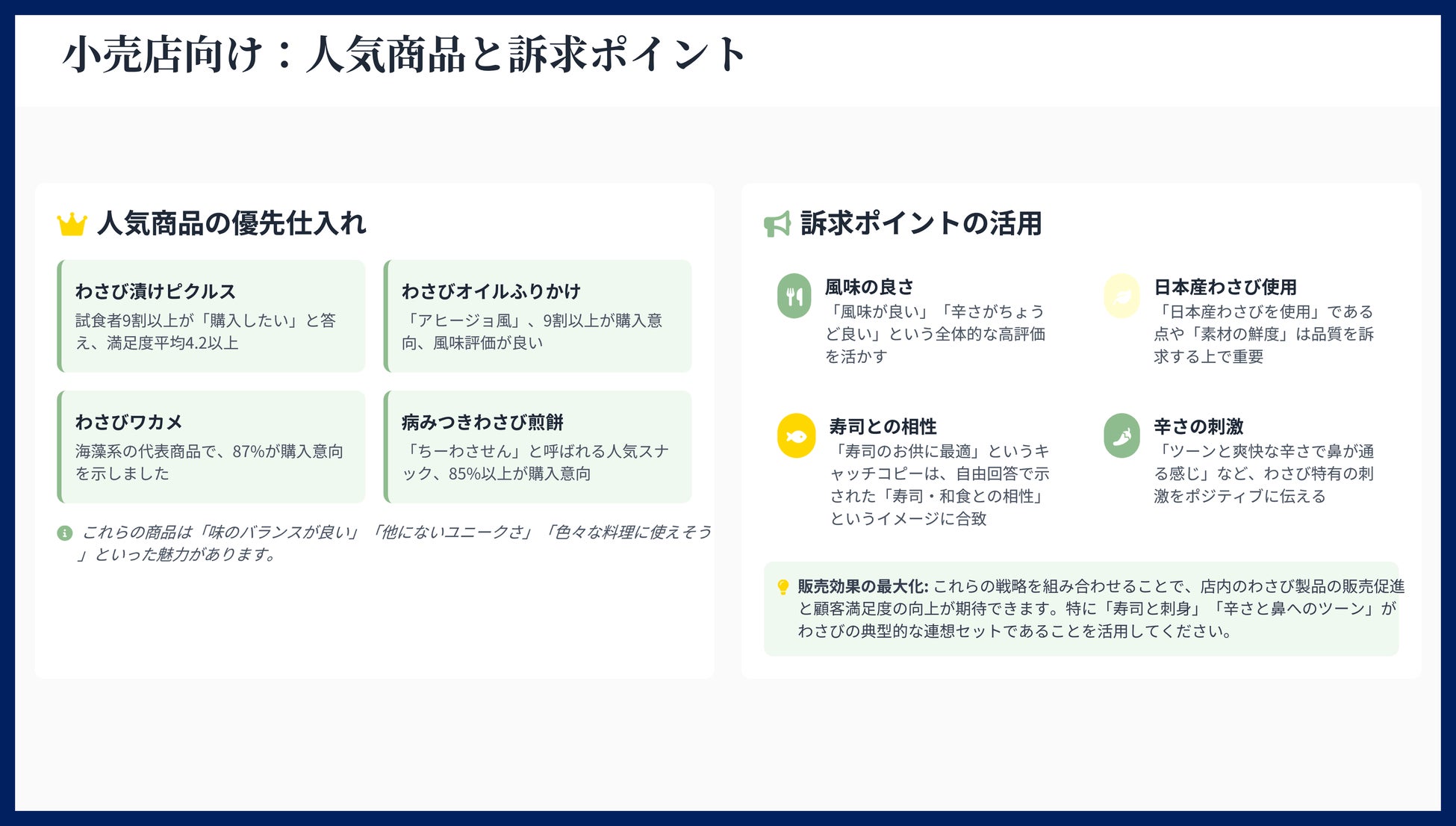 熱量」と「スコアリングデータ」を武器に、現地の有力な卸売企業やバイヤーへの商談を実施します。単なる商品提案ではなく、「現地でこれだけの評価と価格受容性がある」という事実ベースの提案を