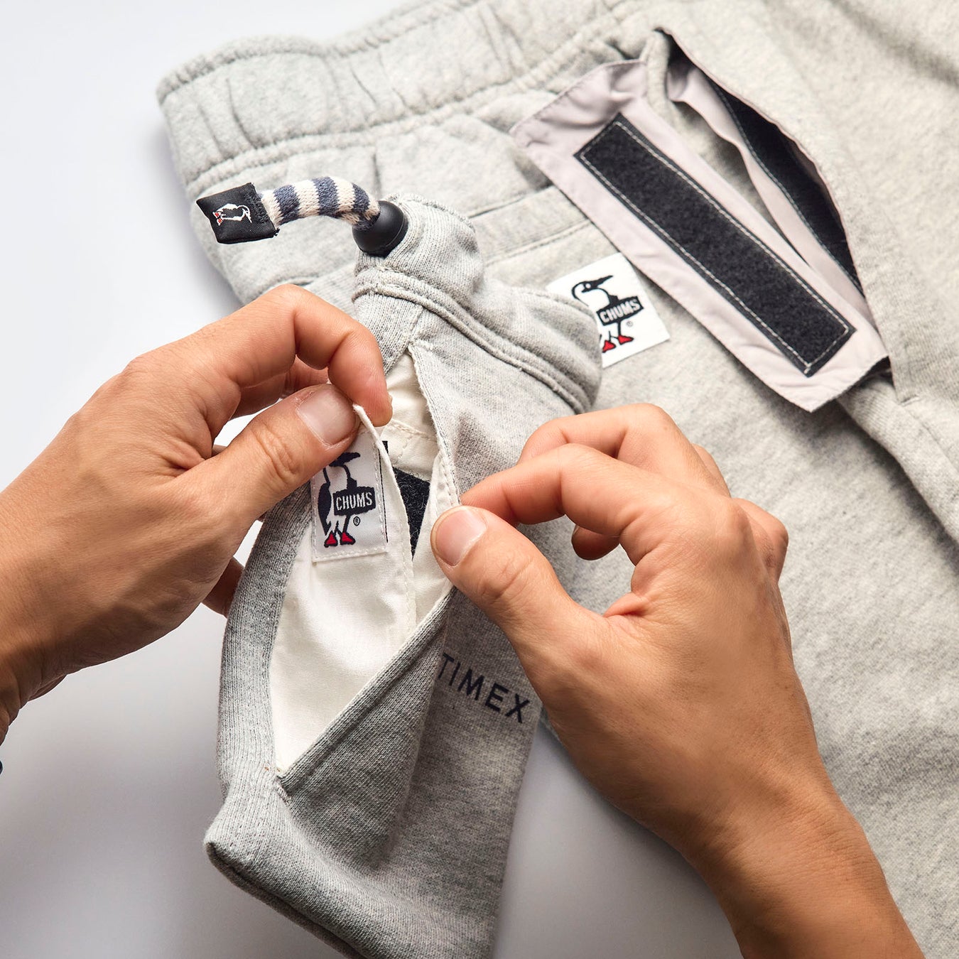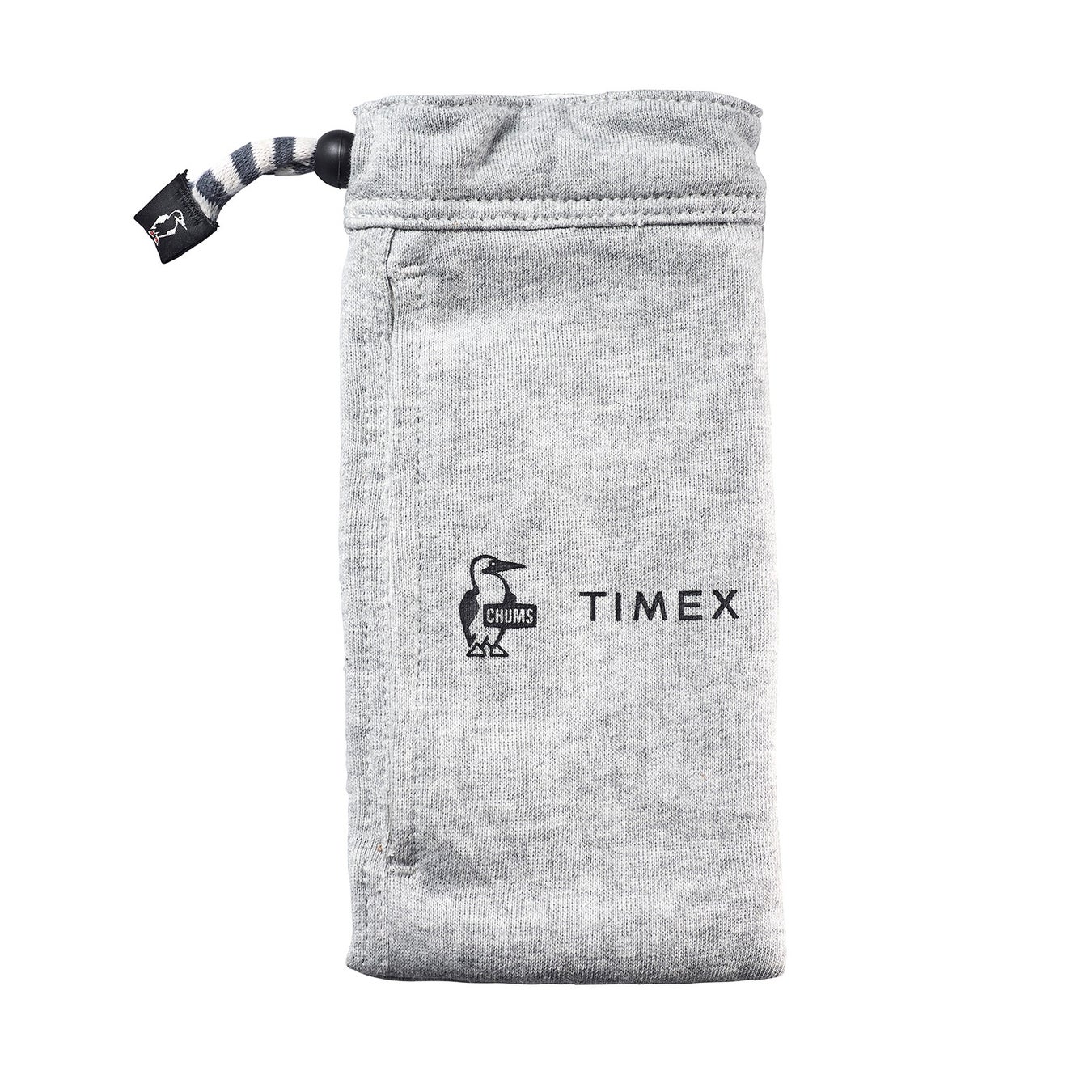 付属品として同じく1980年代に誕生したスウェットショーツ「Hurricane Walkers」のデザインソースを時計ポーチに落とし込んだ今回のコラボレーション限定時計ポーチ付き。CHUMS起源の“オリジナルリテイナー”をモチーフにしたアジャスターが巾着仕様になりCHUMSとTIMEXのロゴをプリントしたスペシャル時計ポーチです。
