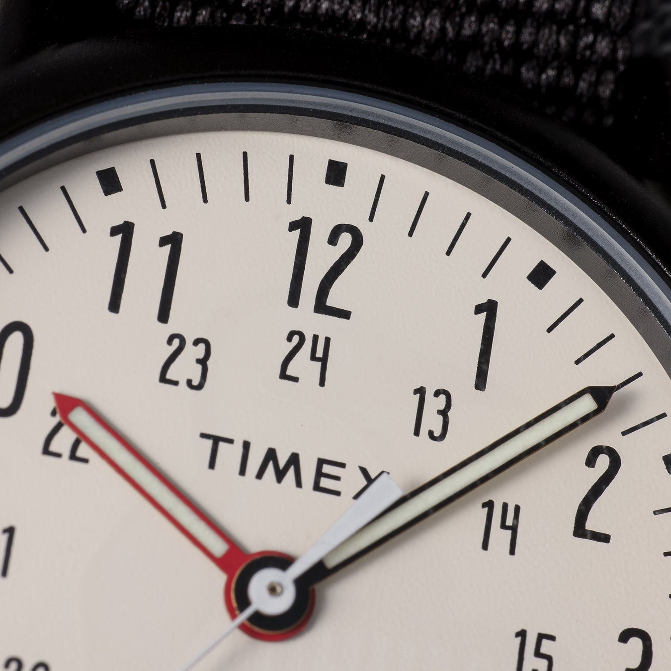 ペンシル針は長針がTIMEXのBLACK・短針がCHUMSのREDの配色で、夜のキャンプでも視認しやすいように蓄光針にしたアウトドアやキャンプでも活躍する仕様です。