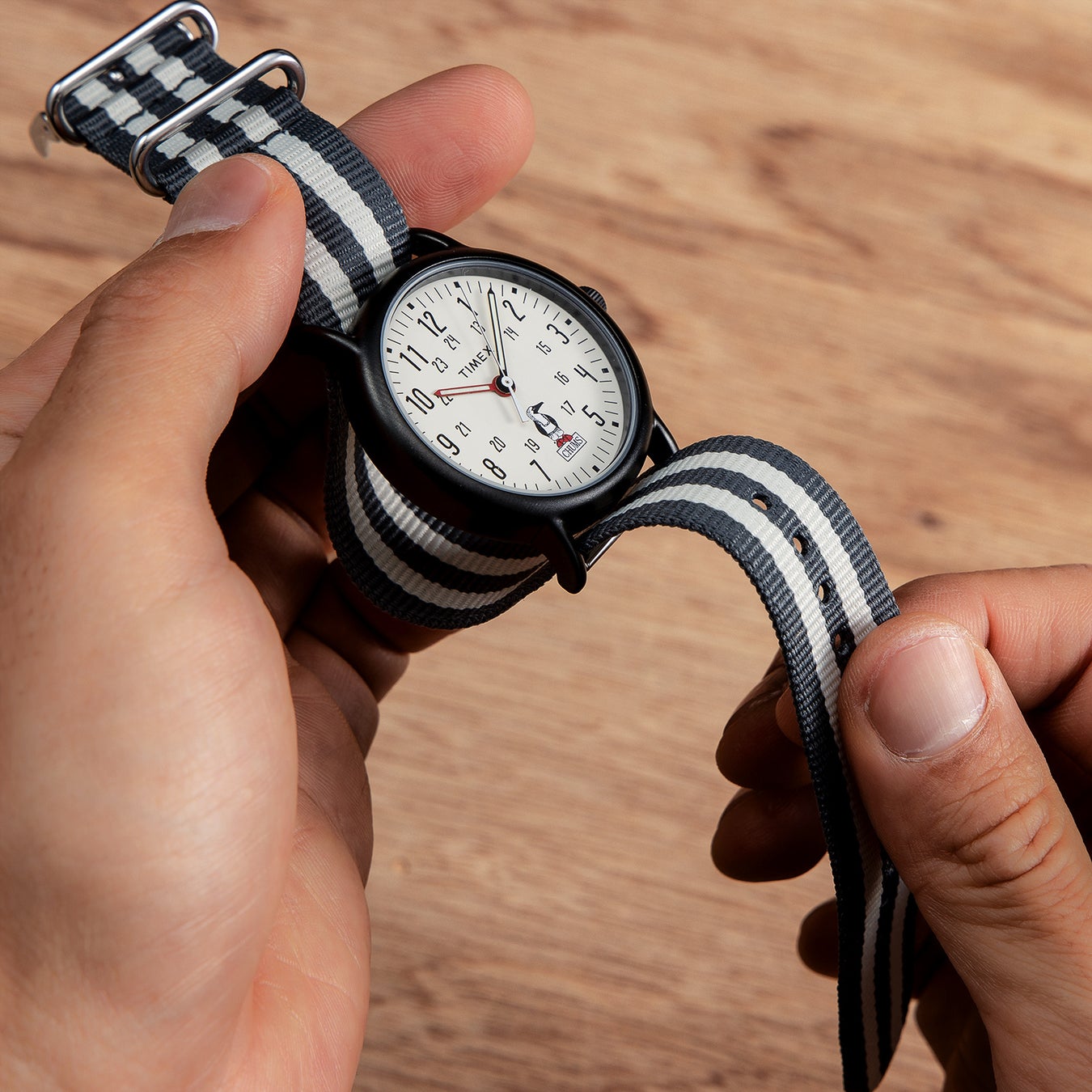商品名はCHUMSの合言葉「HANG WITH YOUR CHUMS!」(仲間と一緒に楽しもう!)頭文字とTIMEXの名作「WEEKENDER」を掛け合わせて誕生しました。
