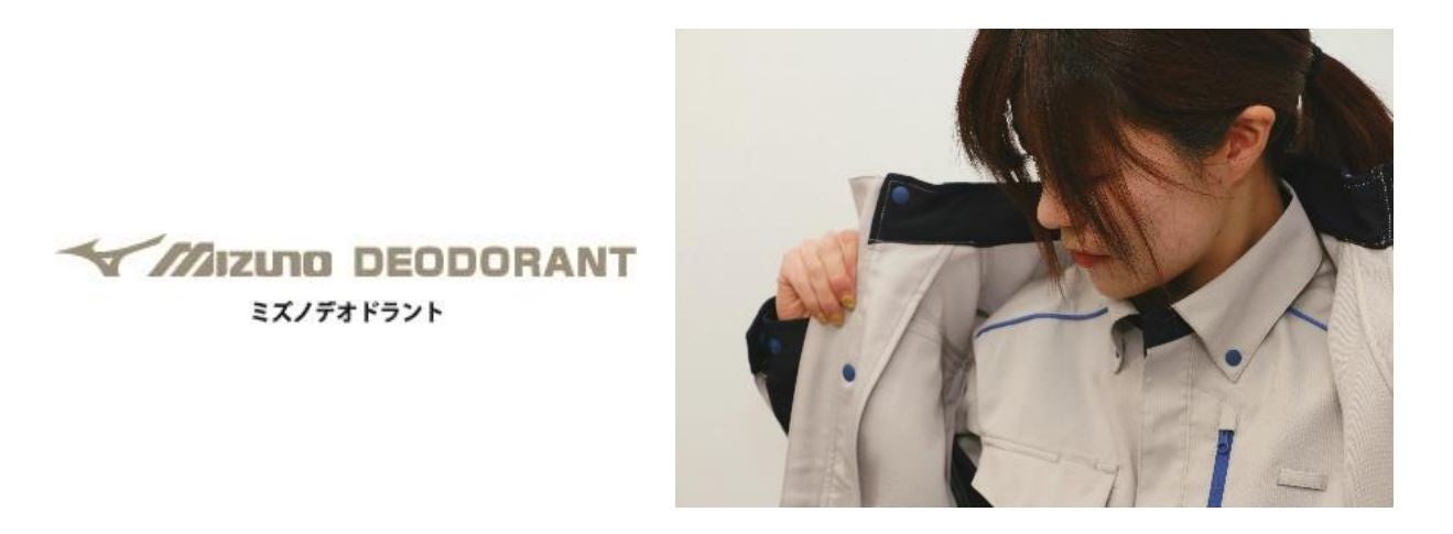 ブルゾンの襟元と脇部分には、ニオイの元を分解する『ミズノデオドラントテープ』を採用しています。汗のニオイの元となるアンモニア、酢酸、イソ吉草酸や加齢臭の成分であるノネナールを中和分解し、気になるニオイを軽減します。