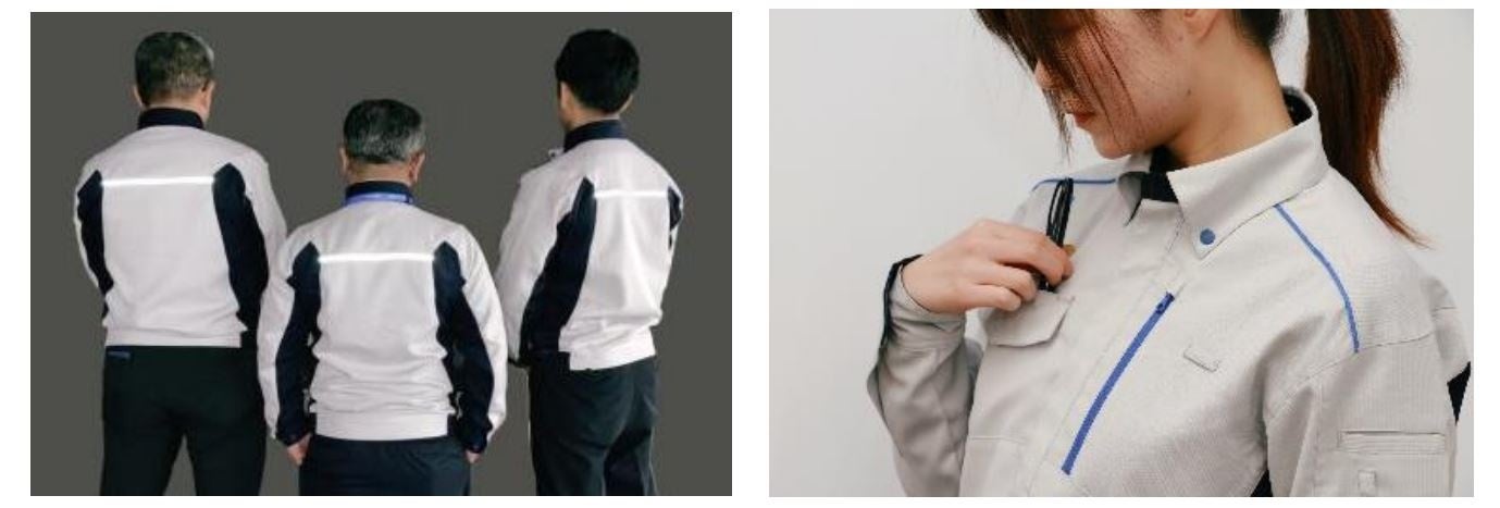 通年用ジャケットと長袖シャツの背中には、再帰反射のパイピングを入れ、夜間の視認性を向上しています。また、長袖シャツは前立てを比翼仕様にすることで、ボタンによる物品等への干渉を防止するなど、安全面に考慮したカスタマイズを行っています。