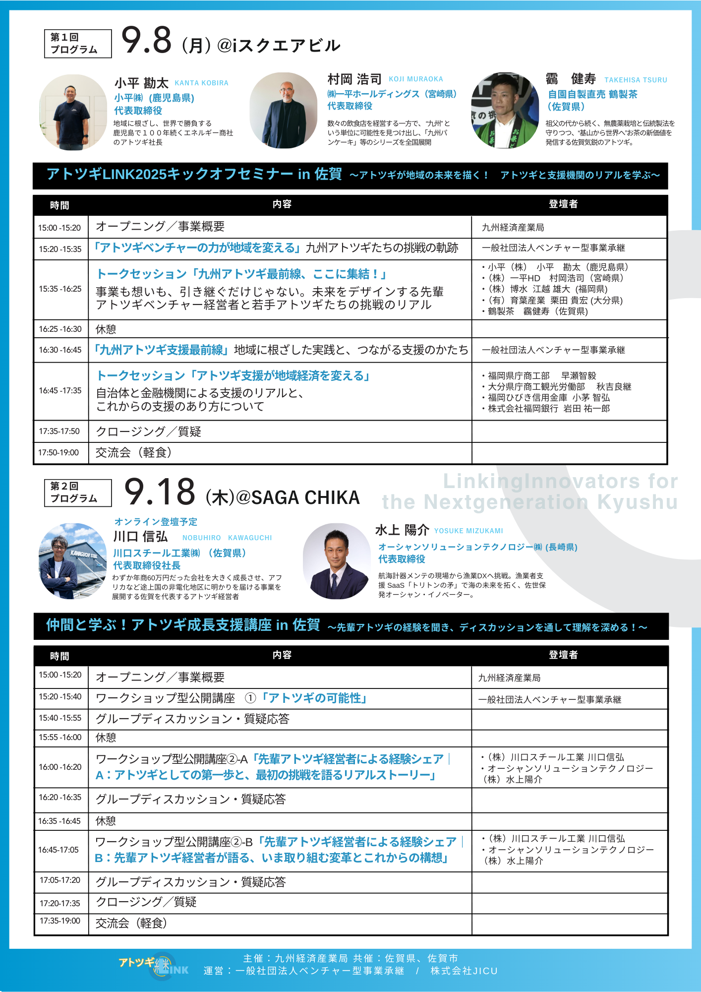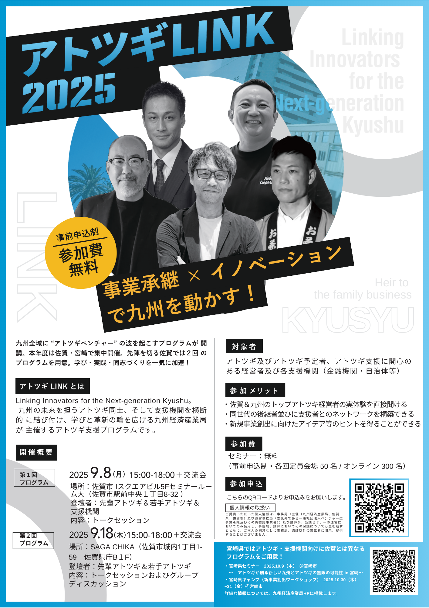 その先陣を切る佐賀では、第1回セミナー(2025/9/8)で、先輩・若手アトツギ及び支援機関同士のパネルディスカッションを通してアトツギの現状を学び、第2回セミナー(2025/9/18)では、先輩アトツギの話を聞いてディスカッションを行います。