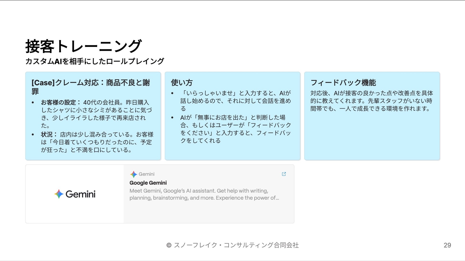 カスタムAIを活用し、「ベテラン販売員」や「クレームを言う顧客」の人格をAIに設定。AIを相手にした接客ロールプレイングの実演を行いました。人間相手では回数が限られるトレーニングも、AI相手なら何度でも納得いくまで練習でき、即座にフィードバックが得られる利点を提示しました。