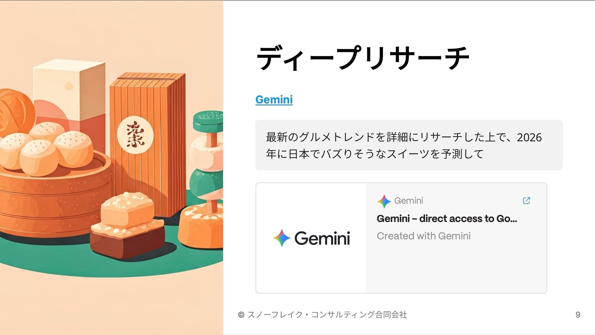 「Deep Research(Gemini)」を用いて、2026年の食トレンドに関する膨大なWeb情報を短時間で収集・レポート化し、それを「NotebookLM」に読み込ませて対話形式で分析する高度なリサーチ手法を実演しました。