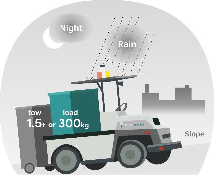 eve autonomyは工場や物流施設向けに、主に屋外における事前の設備工事を必要とせずに自動搬送システムの導入を実現するソリューション「eve auto®」を提供しております。屋外環境においては、段差や坂道などの路面環境に加え、雨や日照の天候条件など、屋内より厳しい環境での運用が求められます。eve auto®は、高い信頼性により全国で活用されているEVカートと、一般公道においても活用される最先端の自動運転技術を活用し、雨天や夜間でも工場等の敷地内屋外環境で自動運転レベル4での無人搬送運用を実現しているため、24時間稼働が求められる施設での運用も可能です。